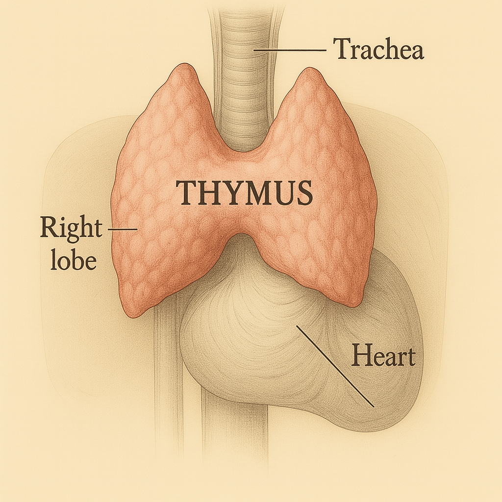 Thymus, birincil lenfoid organ olup, immün sistemin merkezinde yer alır. Özellikle: