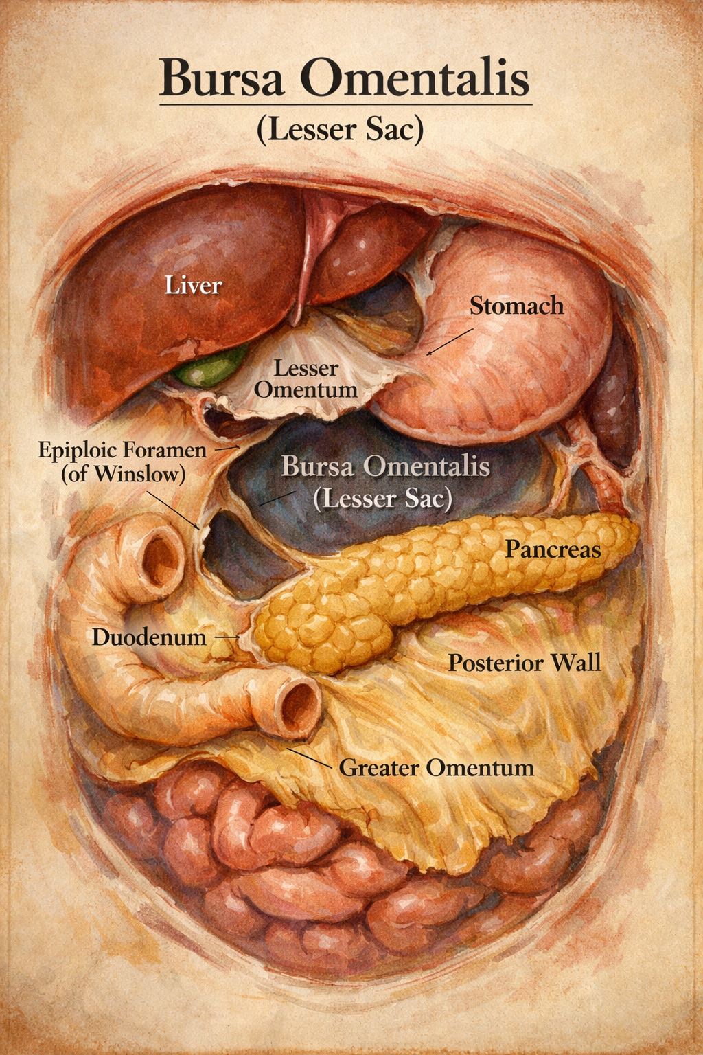 - ve 19. yüzyıllar, anatomik terminolojinin standartlaşması ve mikroskobik düşüncenin yükselişiyle karakterize edilir. Bu dönemde bursa omentalis, yalnızca betimleyici bir yapı olmaktan çıkıp, fonksiyonel ve klinik bağlamda da tartışılmaya başlandı. Cerrahi girişimlerin artması, özellikle mide ve pankreas patolojileri sırasında bu boşluğun önemini görünür kıldı. Anatomistler, bursa omentalis’in pankreasın ön yüzüyle olan yakın ilişkisini vurgulayarak, bu alanın patolojik sıvı birikimleri ve enfeksiyonların yayılımı açısından taşıdığı önemi ortaya koydular.