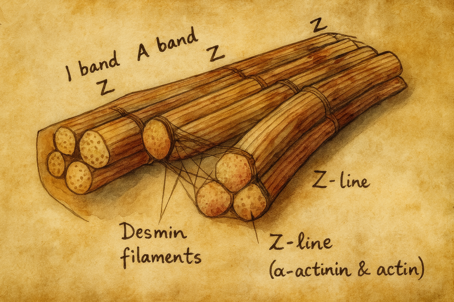 Desmin’in hikâyesi, hücre iskeletinin üçüncü kolu olan intermediyer filamentlerin kas hücresinde bıraktığı ilk izlenimle başlar. 1960’ların sonlarından itibaren elektron mikroskopisi, kas hücrelerinde 100 Å (≈10 nm) çaplı iplikçikleri yakaladığında, bu yeni fibrillerin ne olduğu tam olarak bilinmiyordu; bilinen iki “dev” vardı: mikrofilamentler (aktin) ve mikrotübüller. Kas hücresinde görülen bu üçüncü filament ailesi, bir süre “10-nm filamanlar” olarak anıldı; işlevleri belirsiz, fakat varlıkları tartışmasızdı.