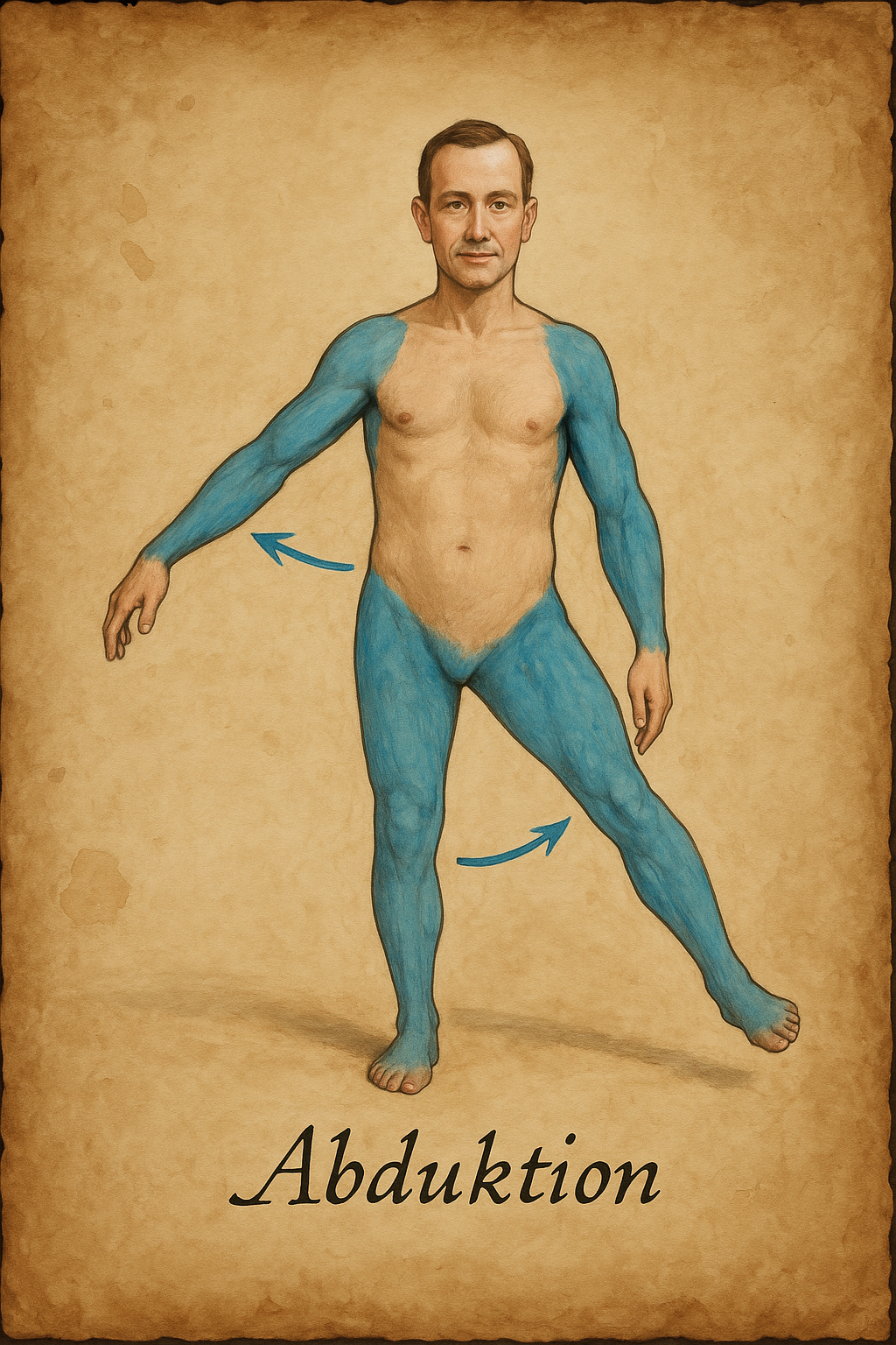 1543’te Vesalius’un anatomi tiyatrosu, bedene dair sözcüklerin çıplak gerçeklikle sınandığı bir sahneye dönüştü. Kasların çekiş doğrultuları iskeletin üç düzlemine yerleştirildi; uzvun “orta hattan uzaklaşması” için gerekli kuvvet kolları ve eklem yüzeyleri betimlendi. Realdo Colombo ve Falloppio gibi cerrah-anatomi köprüsünün ustaları, üst ve alt ekstremitede abdüksiyonun hangi kas lifleriyle başladığını ve hangi bağ-kapsül gerilimleriyle sınırlandığını ayrıntılandırdılar.