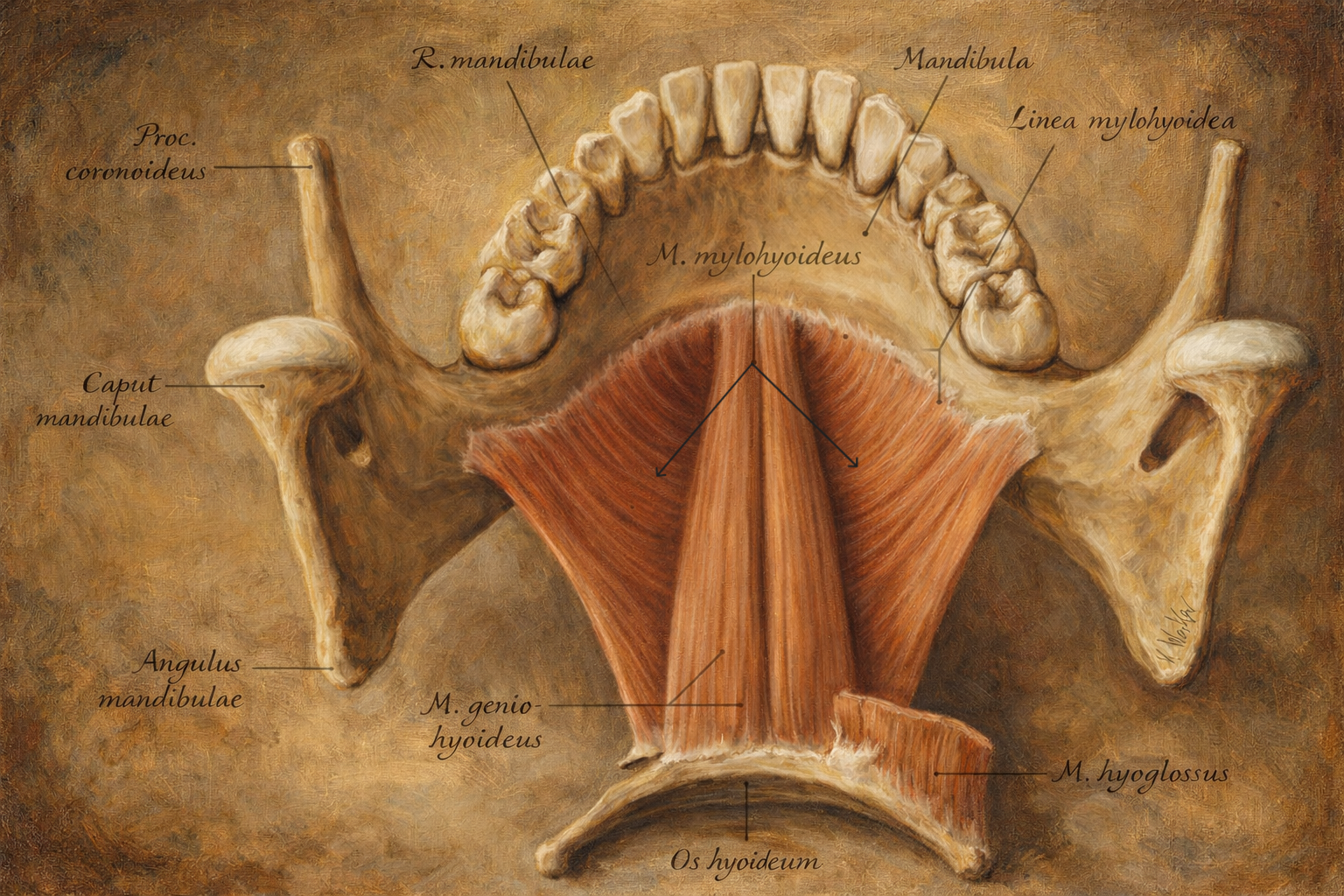 - ve 16. yüzyıllarda Avrupa’da diseksiyonun eğitim ve araştırmaya yeniden güçlü biçimde girmesi, ağız tabanının “gözle görülebilir” bir anatomi nesnesine dönüşmesinin kırılma noktası oldu. Bu dönemin en etkili adı Andreas Vesalius’tur. Vesalius’un metodolojik devrimi, tek bir kasın adını koymaktan daha fazlasını yaptı: diseksiyonu otorite metinlerinden bağımsızlaştırdı, kasların tabakalar hâlinde ayrılabileceğini ve her tabakanın belirli bir mekaniğe hizmet ettiğini öğretti. Ağız tabanı diseksiyonlarında mandibulanın iç yüzüne tutunan geniş, yassı bir kas levhasının iki tarafta simetrik seyrettiği; orta hatta birleştiği; hyoid çevresiyle süreklilik kurduğu giderek daha belirginleşti. Bu, bugün mylohyoid olarak bildiğimiz yapının “kas plağı” karakterinin anatomik zihne yerleşmesiydi.
