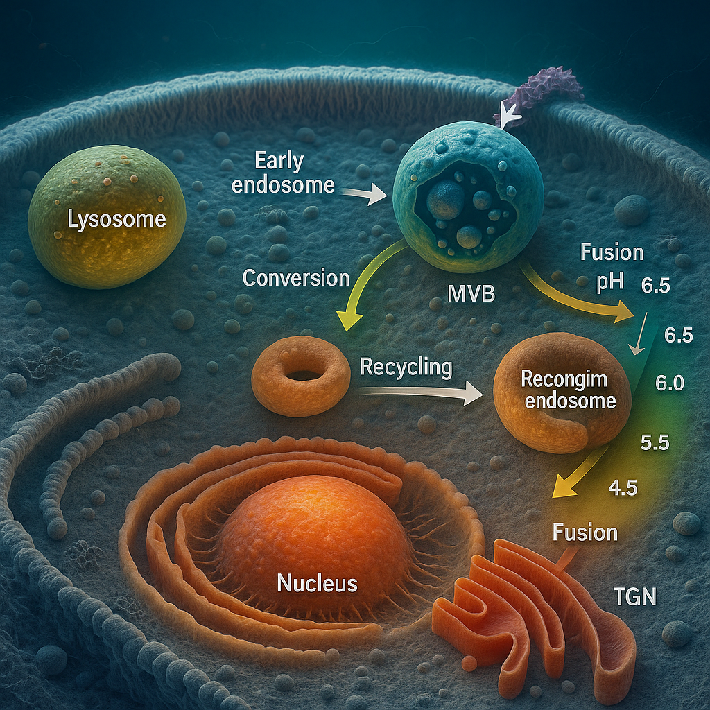 Erken Endozom (EE): Rab5 ve EEA1 ile tanımlanır; pH ~6.0–6.5. PI3P açısından zengindir. Hızlı geri dönüşüm (Rab4) ve yavaş geri dönüşüm (Rab11) kollarına ayrımın başlıca düğümüdür.
