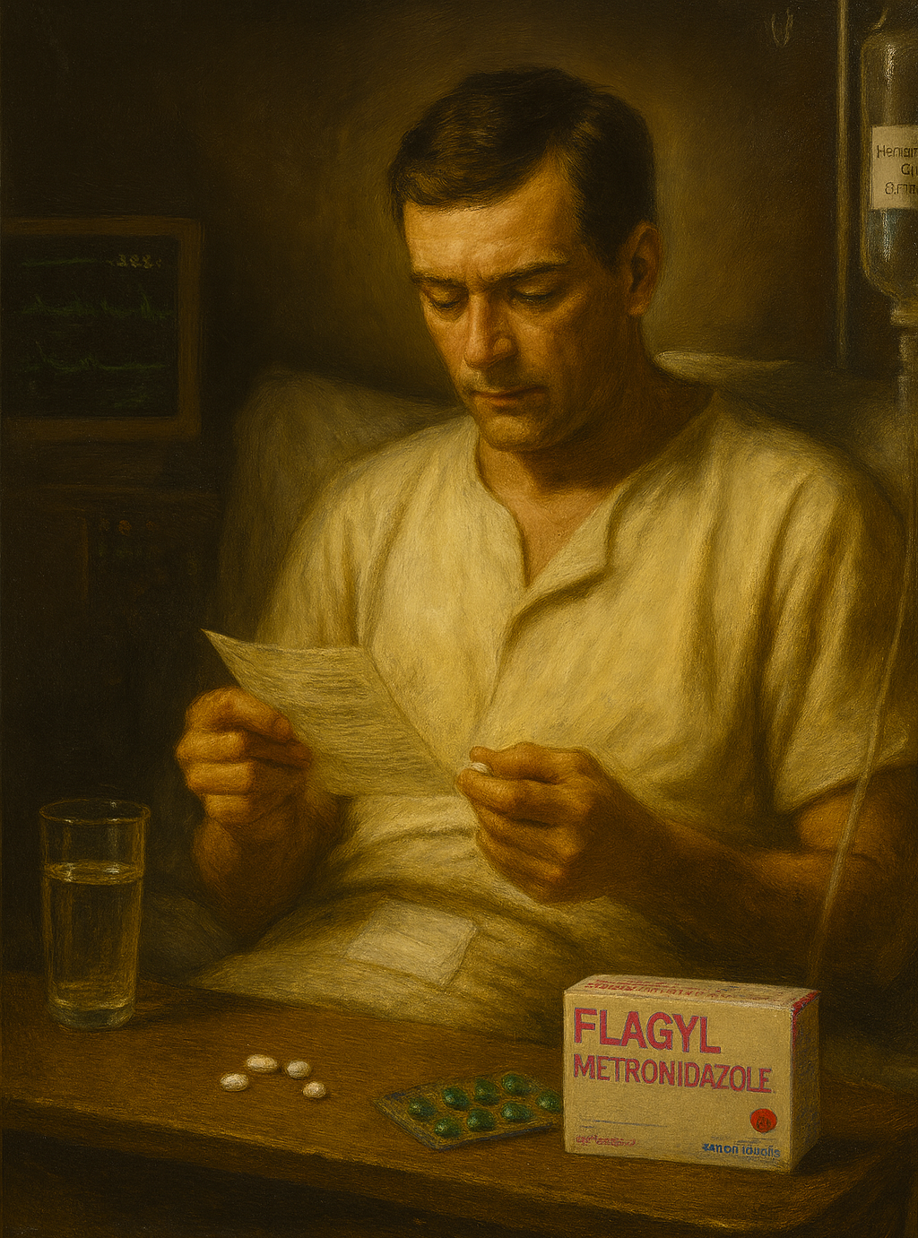 Fransa’da yürütülen bir dizi sentez–tarama çalışmasında 1-(2-hidroksietil)-2-metil-5-nitroimidazol, kod adıyla RP 8823, güçlü antitrikomonas aktivite ve iyi ağızdan emilim profili ile öne çıktı. Kısa zaman içinde “metronidazol” adıyla klinik geliştirmeye alındı ve ilk hedef endikasyon, o dönemin sık ve tedavisi güç cinsel yolla bulaşan enfeksiyonlarından Trichomonas vaginalis oldu. 1959’a gelindiğinde, metronidazolün trichomoniasis tedavisinde yüksek kür oranları sağladığı ve hasta tolere edilebilirliğinin belirgin şekilde daha iyi olduğu gösterildi; ilacın Flagyl ticari adıyla pazara çıkışı da bu döneme denk gelir. Bu aşamada metronidazol, “modern, güvenilir antiprotozoal” olarak tanındı; antibakteriyel potansiyeli ise henüz genel kabul görmemişti.