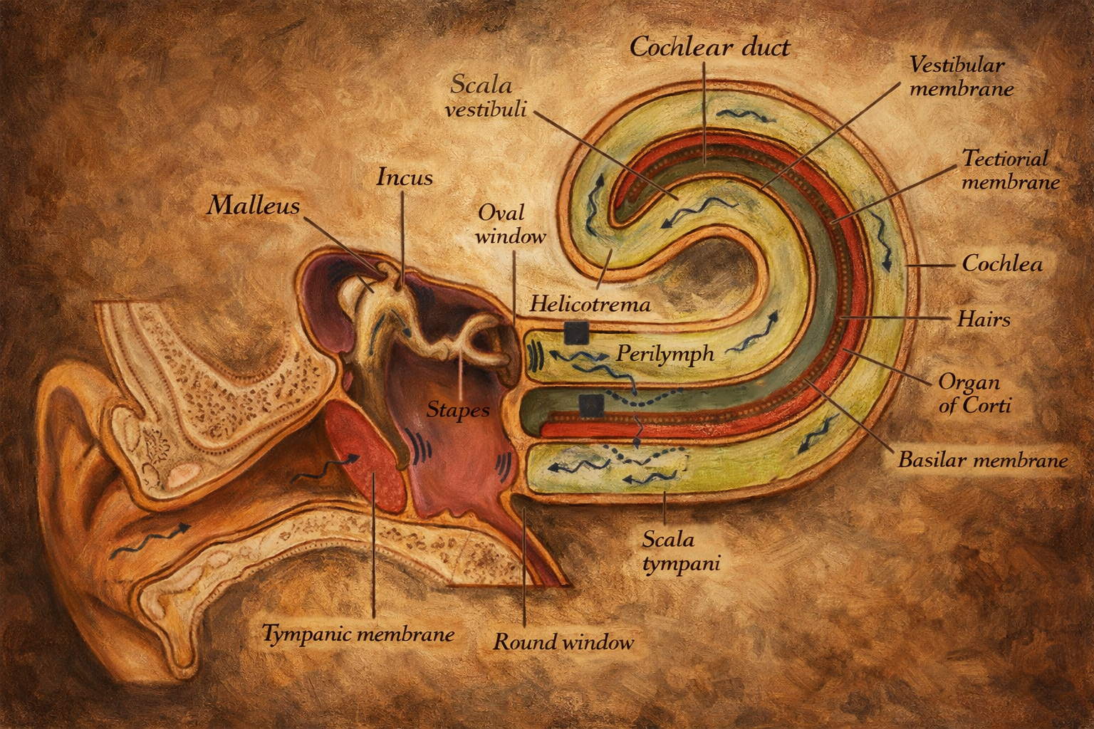 yüzyılda işitmenin fiziğini ve algının kuramsal temelini kurma çabaları ivme kazandı. Bu çizgide Helmholtz’un çalışmaları, sesin doğası ve algının fizyolojik temelleri üzerine düşünmeyi derinleştirdi. Oval pencere bu büyük çerçevede, dış dünyadaki dalganın iç kulağın sıvısal evrenine çevrildiği yer olarak kavramsallaştırıldı: empedans uyumu, basınç dönüşümü, iletim zinciri gibi fikirler daha sonraki yüzyılda olgunlaşacak olsa da, onların düşünsel zemini bu dönemde oluştu. (pubs.aip.org)