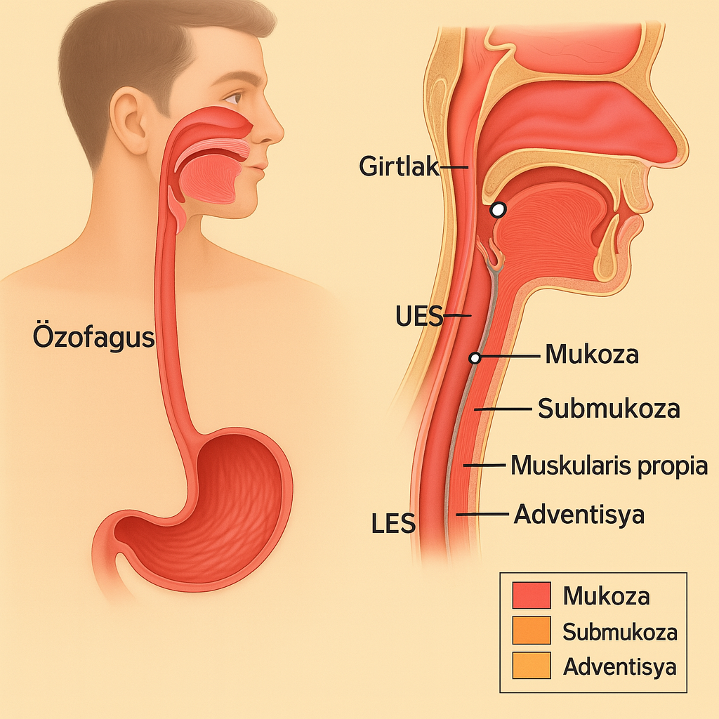 - Üst Özofagus Sfinkteri (UES): Farinks ile özofagus arasındadır; istemli yutma refleksi sırasında gevşer.