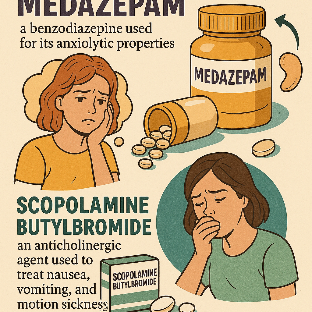 İlaç, anksiyolitik özellikleri için kullanılan bir benzodiazepin olan Medazepam ve bulantı, kusma ve hareket hastalığını tedavi etmek için kullanılan bir antikolinerjik ajan olan Scopolamine butylbromide içerir.