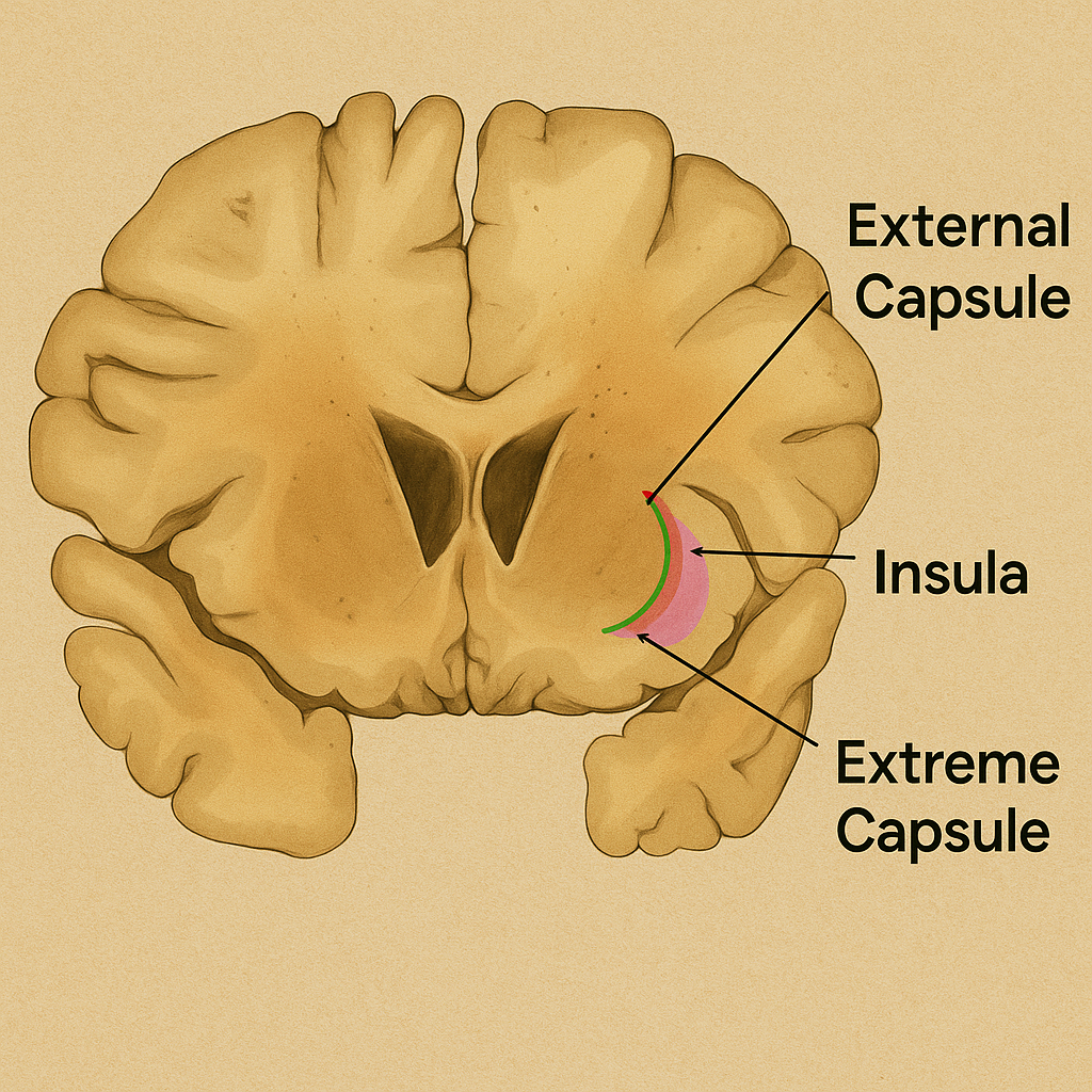 - Mikroyapı: Capsula extrema, çoğunlukla miyelinli asosiyasyon liflerinden oluşur; lifler dikey değil longitüdinal/oblik yönelimlidir. Klaustrum sınırında kısmi U-lifleri ve kısa ara bağlantılar gözlenir; lateral yönde insular korteksin tabakalı mimarisi ile geçiş bölgeleri bulunur.