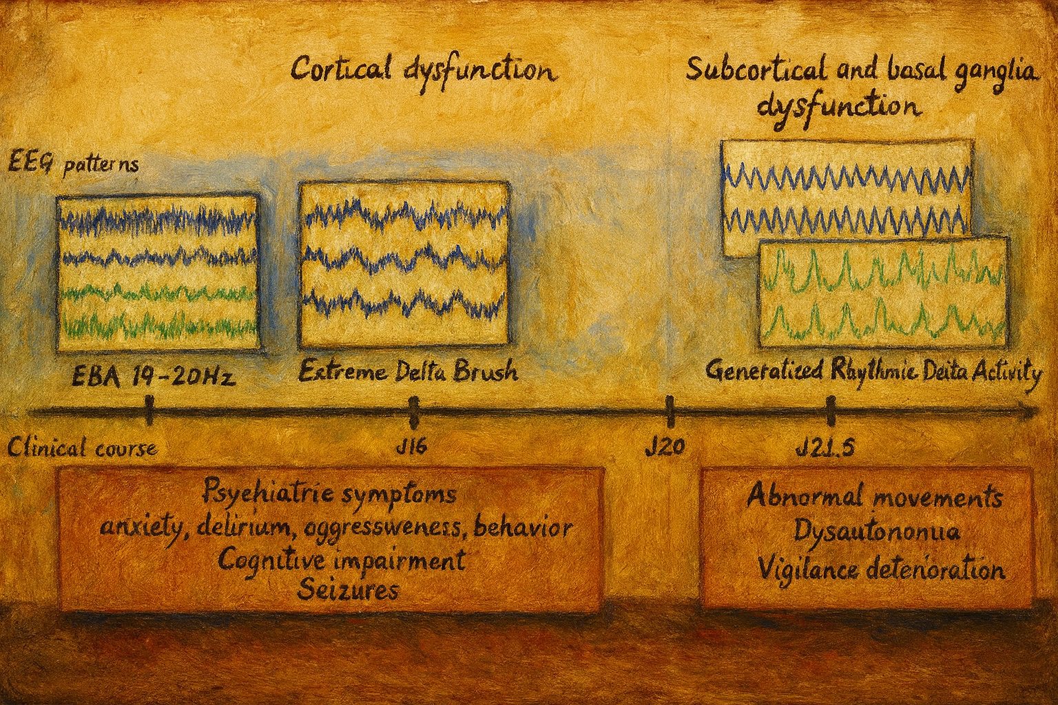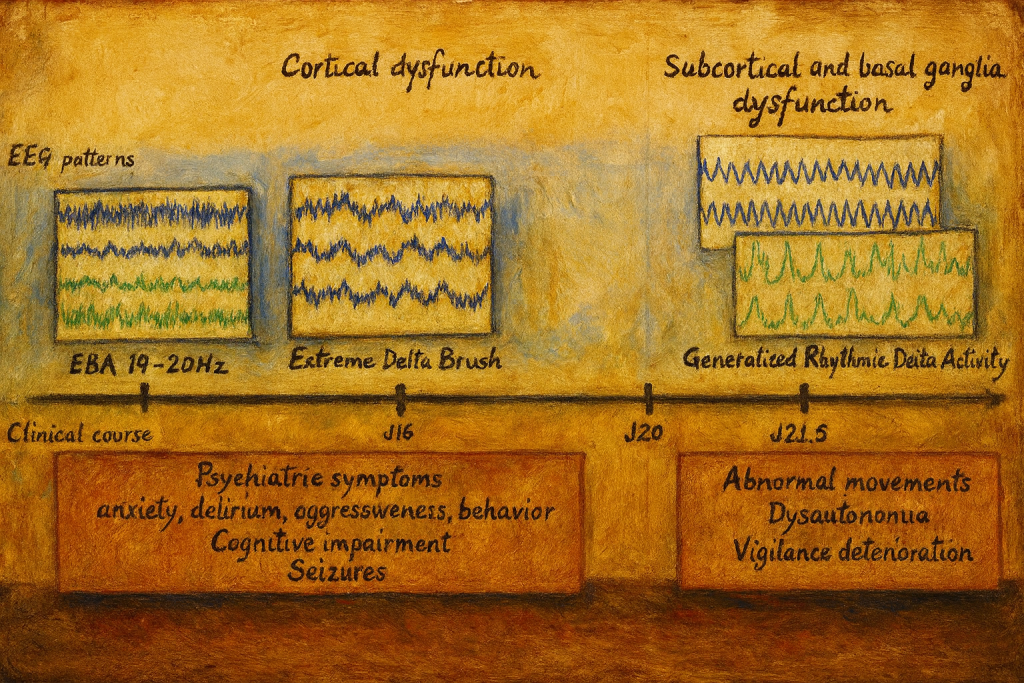- Bazı hastalarda “extreme delta brush” olarak adlandırılan, üzerinde beta aktivite binen yaygın delta dalgaları ile karakteristik bir desen tanımlanmıştır; bu desen anti-NMDAR ensefaliti için nispeten karakteristik kabul edilir.