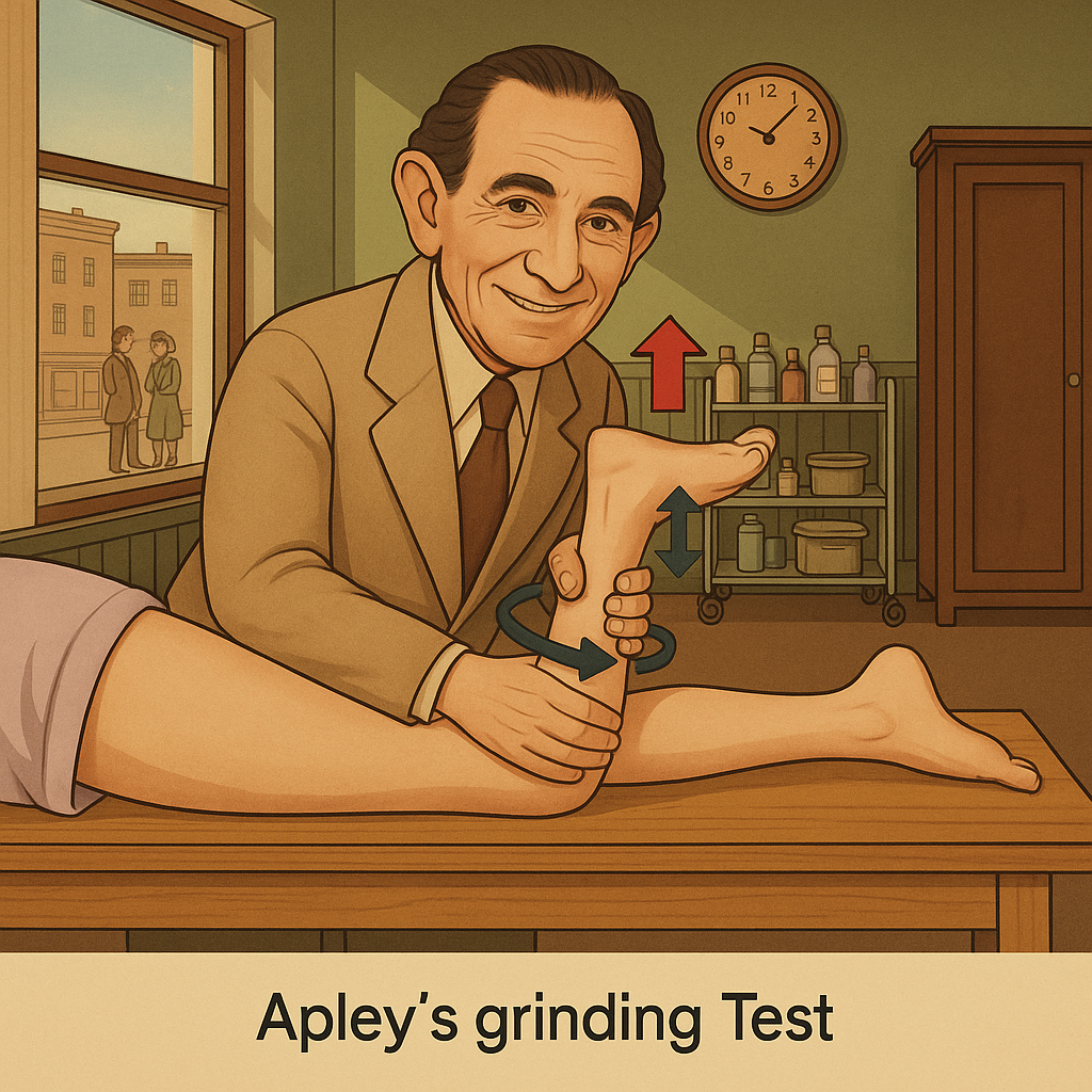 Bu fizyomekanik mantık, 1947’de “The diagnosis of meniscus injuries; some new clinical methods” başlıklı makalesinde detaylandırdığı ve bugün Apley grind (kompresyon) ve Apley distraksiyon testi olarak bildiğimiz manevraların doğmasına yol açtı.(Life in the Fast Lane • LITFL)