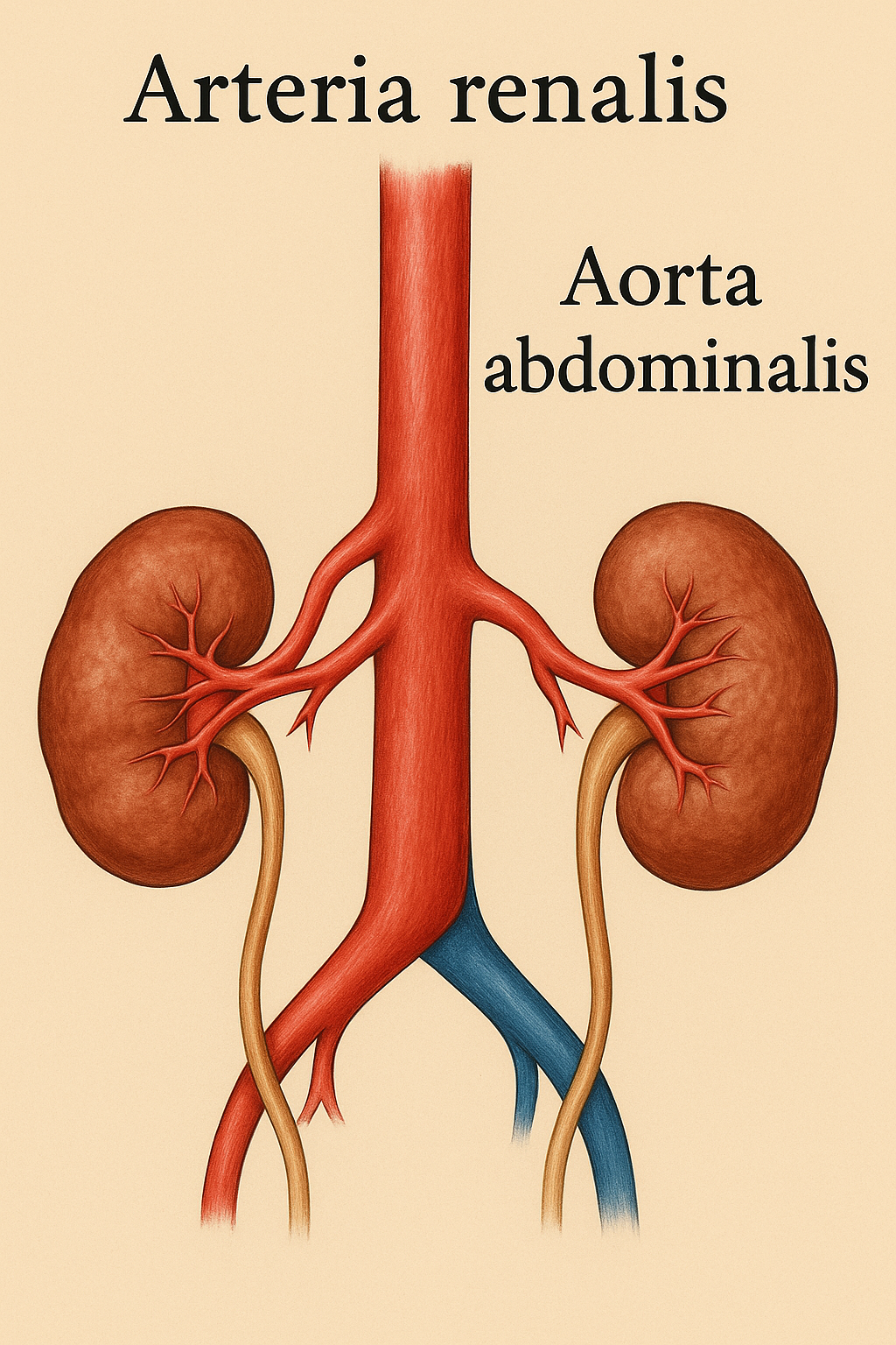 - Arteria renalis (böbrek atardamarı), aortanın abdominal segmentinden (L1-L2 düzeyi) yaklaşık dik açıyla ayrılan, her böbreğe oksijenlenmiş kanı taşıyan çifti damar sistemidir.