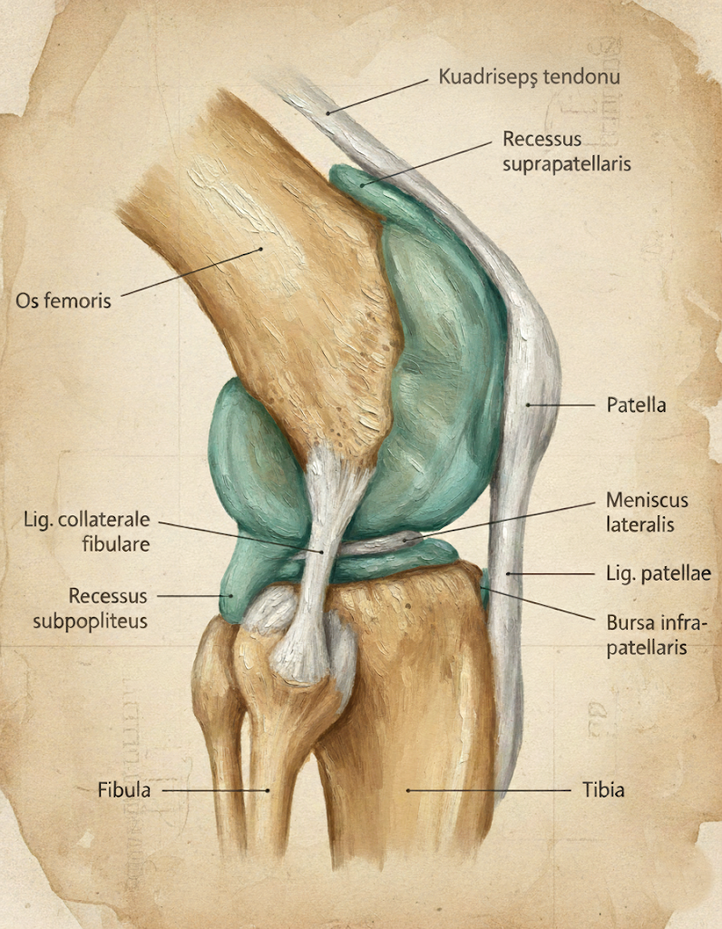 Kapsül dışta fibröz, içte sinovyal membrandan oluşur. Sinovya plicaları (mediopatellar, suprapatellar vb.) embriyolojik septaların kalıntılarıdır; hipertrofi ve impingement durumunda semptomatik hale gelebilir. İnfrapatellar Hoffa yağ yastığı, sinovyanın enine kıvrımlarını doldurur ve propriosepsiyona katkı sağlar.