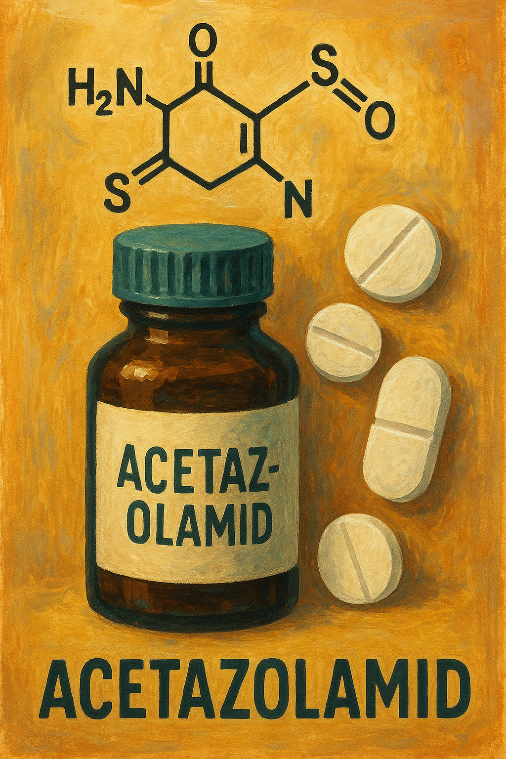 - Kimyasal Özellikler: Moleküler formülü C₄H₆N₄O₃S₂ (m.a. ≈222,24 g/mol) olan asetazolamid, N-(5-sülfamoil-1,3,4-tiadiazol-2-il)asetamid olarak da adlandırılır. Zayıf asidik (pKa≈6,5–7 civarı) bir bileşik olup, suya çok az, alkole az çözünebilir.