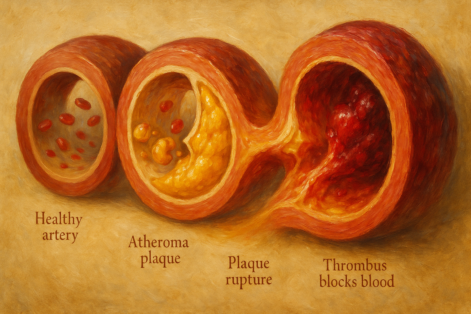 1913’te Anitschkow’un kolesterolle beslenen tavşan modeli yağ birikimi teorisine güçlü bir zemin verdi; Gofman’ın lipoprotein fraksiyonlamasıyla hikâye, LDL ve HDL gibi yeni aktörler kazandı. Seksenlerde Glagov’un yeniden şekillenme (“remodelling”) gözlemleri ve doksanlarda Stary’nin ayrıntılı histolojik sınıflaması, lezyonların evrimini standart bir dile bağladı: yağ çizgilerinden fibroateroma, oradan kalsifikasyon ve kırılgan kapağa uzanan bir zaman şeridi.
