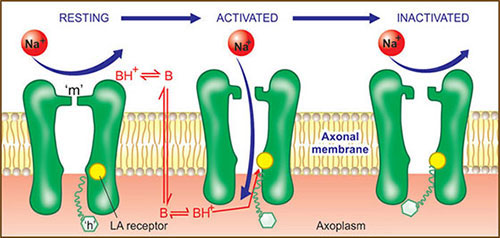 - Benzokain, voltaj kapılı iyon kanalları aracılığıyla sodyum iyonlarının sinir hücrelerine akışını engelleyerek lokal bir anestezik üretir.