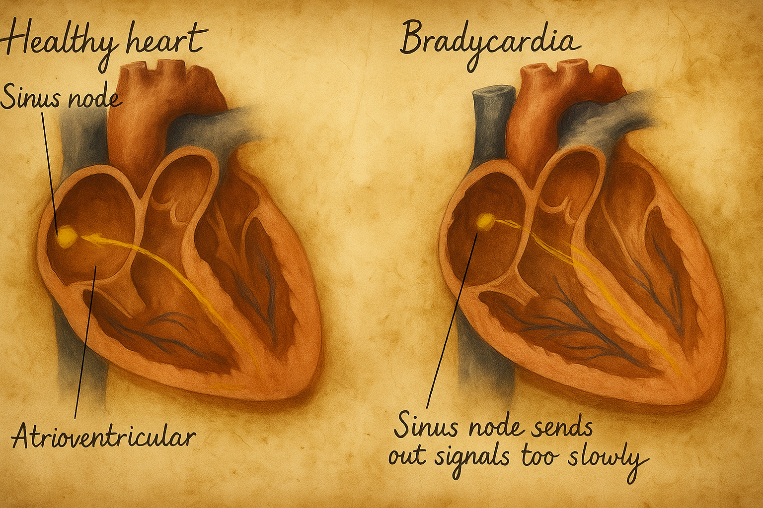 Kalbin doğal pacemaker’ı olan sinüs düğümü (sinoatriyal düğüm), otomatik depolarizasyon kapasitesiyle düzenli uyarılar üretir ve atriyumlar üzerinden atriyoventriküler (AV) düğüme, buradan da His–Purkinje sistemi aracılığıyla ventriküllere iletir. Bradikardi, kabaca üç mekanizma üzerinden ortaya çıkar:
