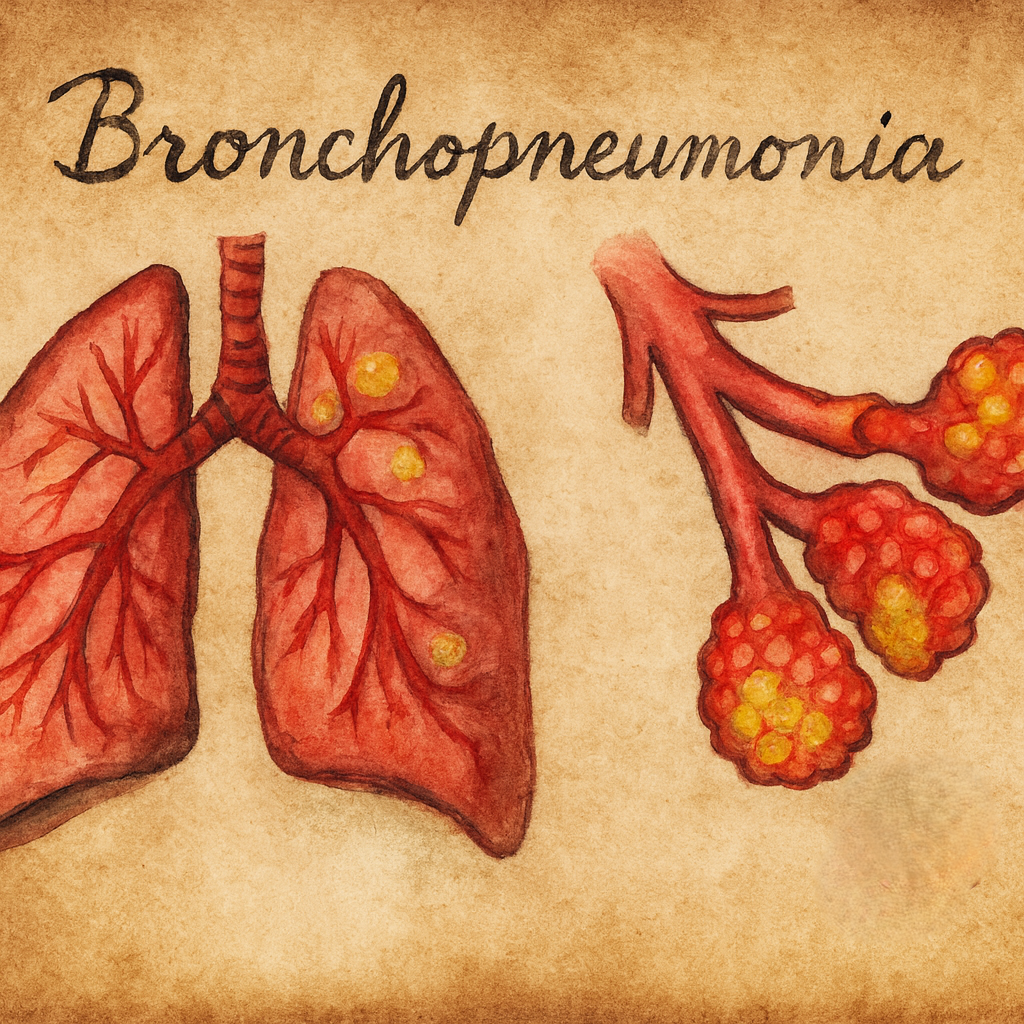 Bronkopnömoni, primer olarak terminal ve respiratuvar bronşiollerde başlayan, oradan bitişik alveoler boşluklara yamalı (multifokal) tarzda yayılan, çoğu zaman iki taraflı ve çok loblu tutuluma yol açan bir alt solunum yolu enfeksiyonudur. Lobar pnömoniden farklı olarak tek bir lobun homogren konsolidasyonu yerine, peribronşiyal merkezli, düzensiz dağılımlı, 0,5–2 cm’lik odaklar hâlinde ilerler ve odaklar zamanla birleşerek geniş hava sahası konsolidasyonları oluşturabilir. Klinik yelpaze hafif-orta şiddetli toplum kökenli enfeksiyondan yoğun bakım gerektiren nozokomiyal pnömoniye kadar uzanır.