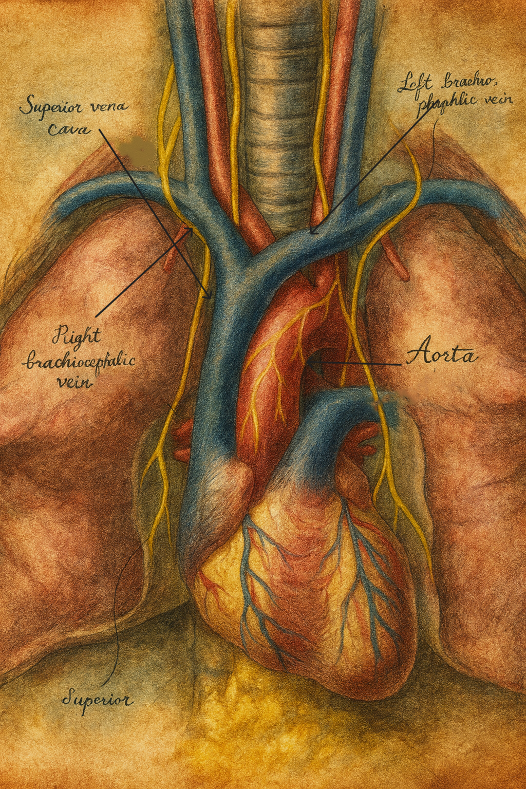 Galen’in şematik bedeninde, karaciğerden doğan büyük bir “vena cava” fikri öne çıkar. Bu damar, karaciğerde üretilen kanı bütün bedene taşır; kalp ise daha çok “pompa”dan ziyade, kanı çekip çeken ve “ruhsal nitelik” katan bir organ gibi resmedilir. Galen için baş-boyun ve üst ekstremite damarları, bu büyük venöz gövdeden çıkan dallardır; ama bizim bugün “vena cava superior” diye ayırdığımız yapı, ayrı isimli ve ayrı kökenli bir anatomik entite olarak henüz formüle edilmemiştir.