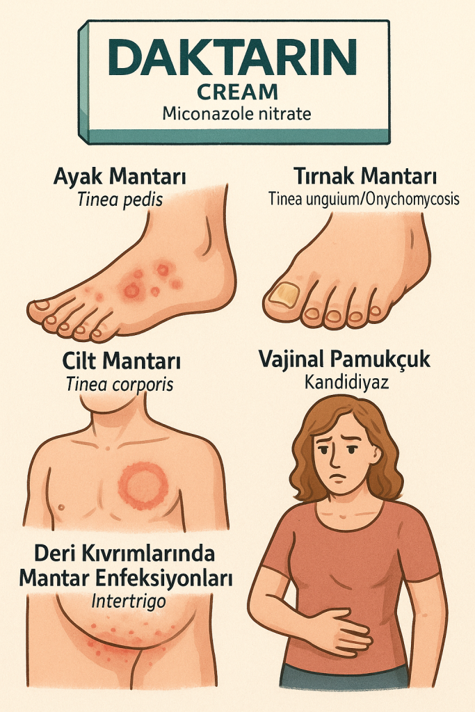 Daktarin Krem, cilt ve tırnakları etkileyen çeşitli mantar enfeksiyonlarının tedavisi için yaygın olarak reçete edilir. Bunlar şunları içerir: