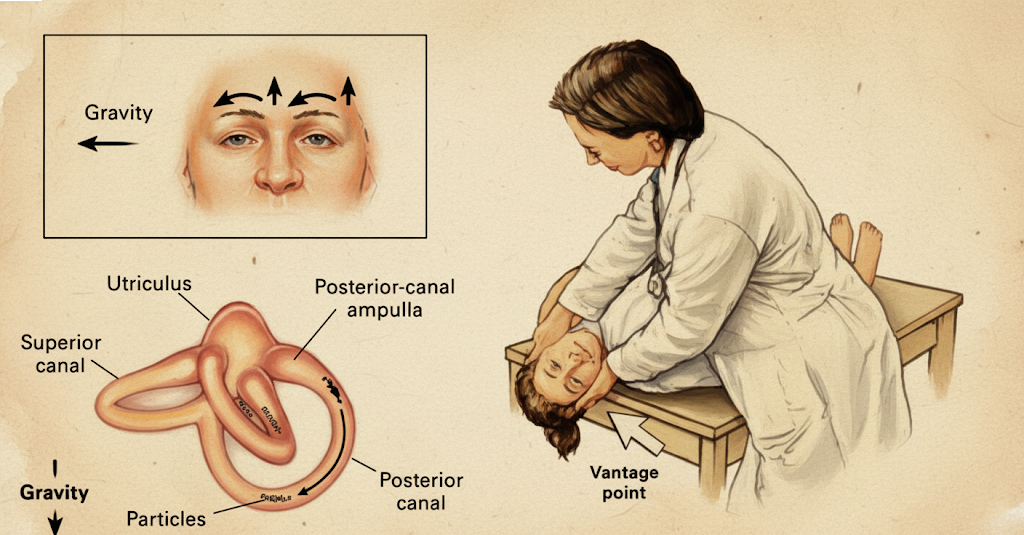 - Kanalitiyazis: Serbest otokoniler posterior kanal lümeninde hareket eder; yerçekimiyle kanal içinde deplase olan partiküller endolenf akısını ve dolayısıyla kupayı uyarır. Tipik olarak kısa latans (saniyeler), kısa süreli (<60 sn) ve yorulabilir (tekrarlandıkça azalan) nistagmusla seyreder.