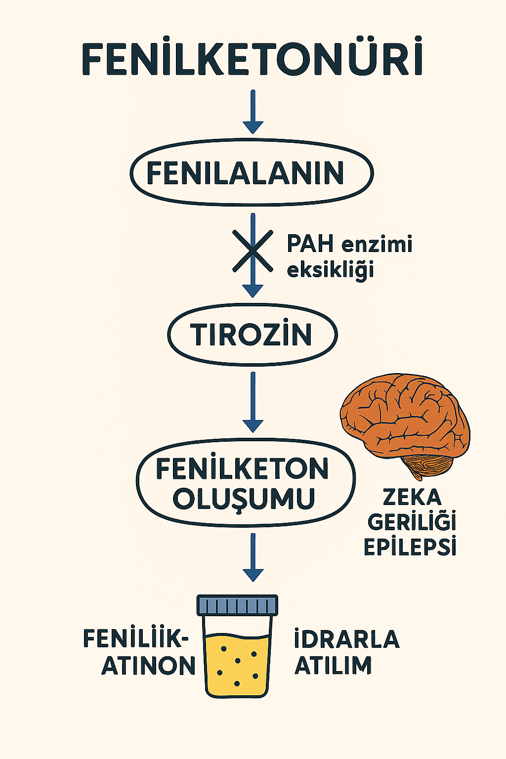 Fenilketonüri (PKU), amino asit metabolizmasında yer alan fenilalanin hidroksilaz (PAH) enzimindeki genetik defekt nedeniyle ortaya çıkan, otozomal resesif geçişli konjenital bir metabolik bozukluktur. Bu enzim fenilalanini, tirozin amino asidine hidroksile eder. PAH enzim aktivitesinin azalmış ya da yok olması sonucu, fenilalanin organizmada birikir ve başta santral sinir sistemi olmak üzere çok sayıda fizyolojik sistem üzerinde toksik etkiler oluşturur.