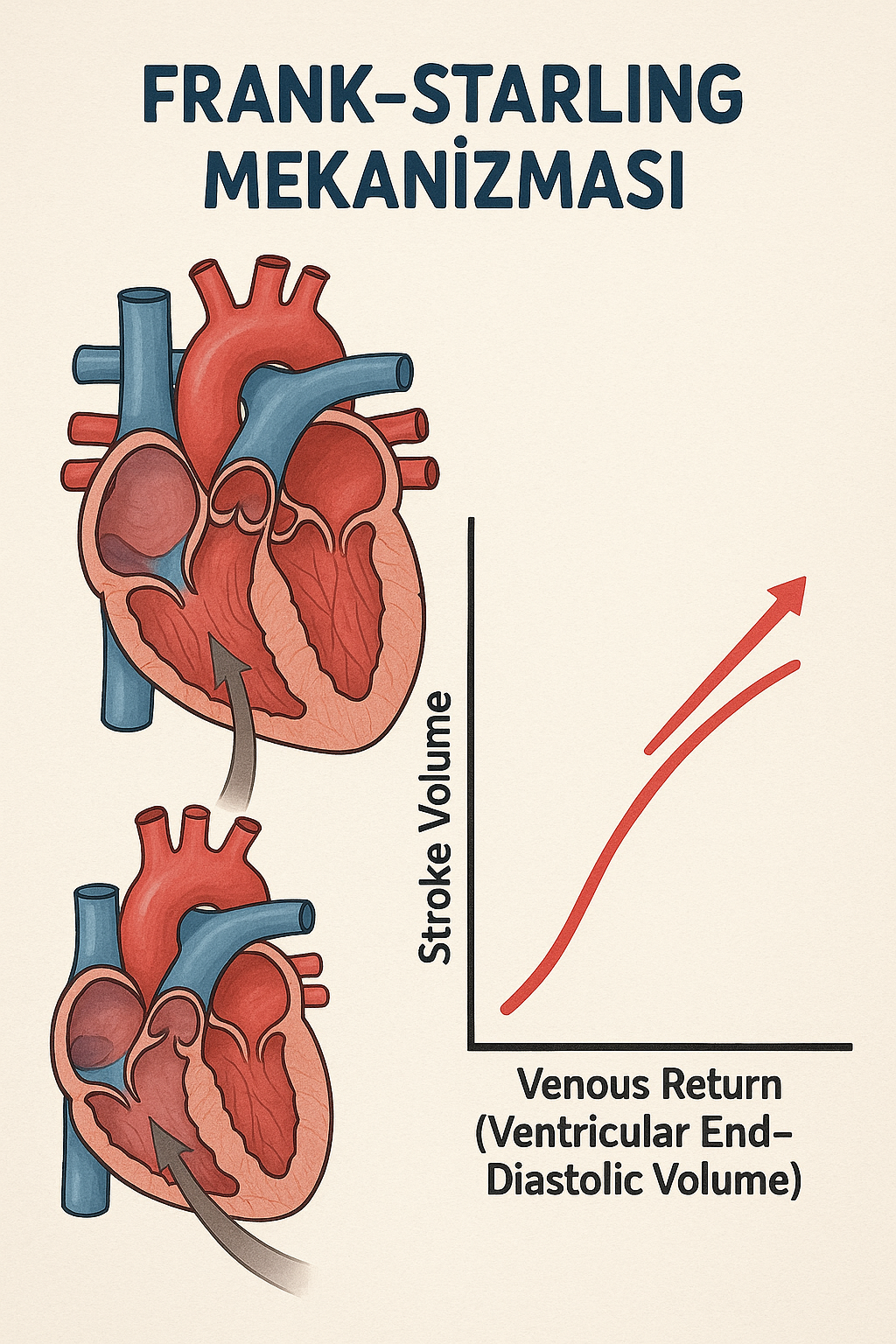 - Konjestif Kalp Yetmezliği: Kronik basınç-/hacim-yüklenmeleri eğriyi aşağı-sağa öteleyerek “düzleşmiş” bir Frank-Starling yanıtına yol açar; sonuçta küçük preload artışları bile pulmoner konjesyona neden olabilir(PubMed).