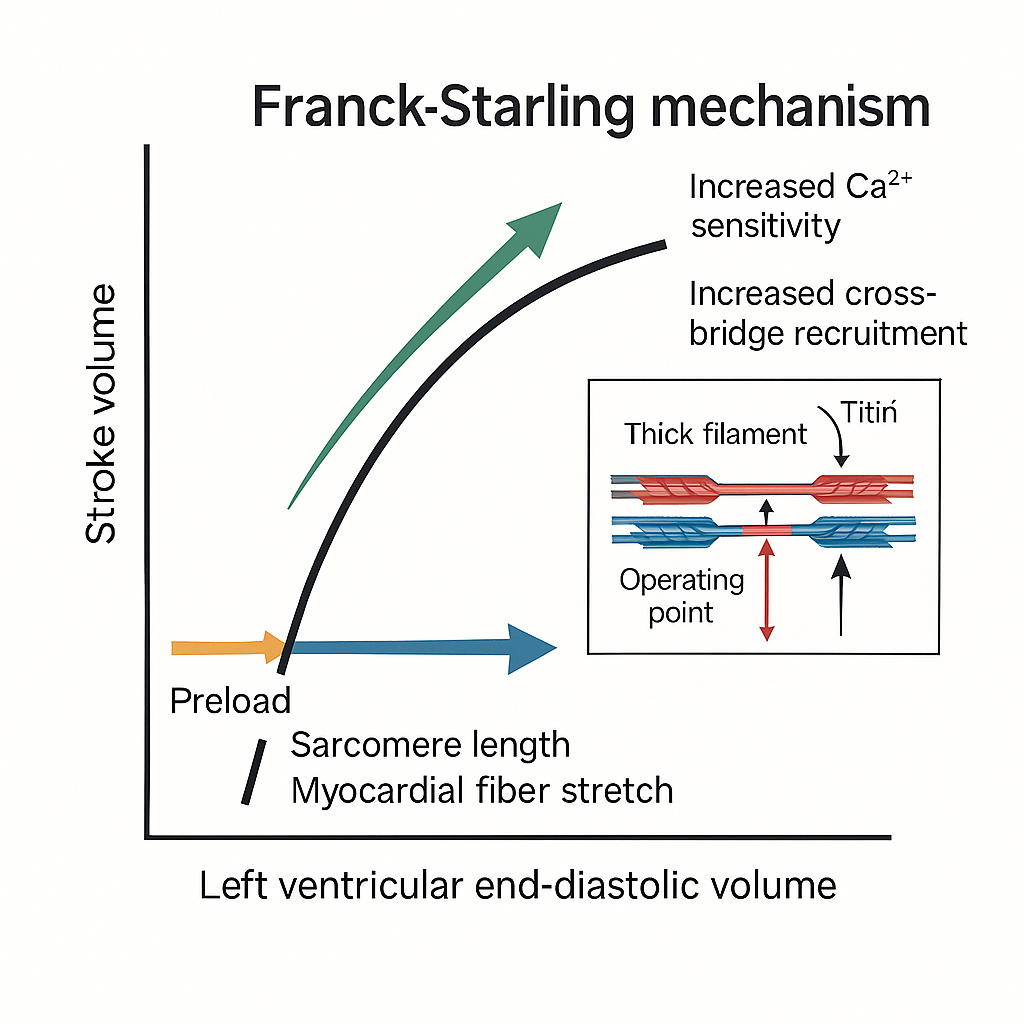 Frank-Starling Mekanizması, sarkomer ölçeğindeki mekanik-biyokimyasal olayları organ düzeyindeki hemodinamik yanıtla bütünleştirir. Güncel veriler, titin tabanlı elastisitenin ve ince-filament troponin modülasyonunun bu asırlık ilkenin hücresel çekirdeğini oluşturduğunu göstermekte; mekano-çevrimsel sinyallemenin bozulması ise kalp yetmezliğinin erken belirleyicisi olarak öne çıkmaktadır(annualreviews.org).