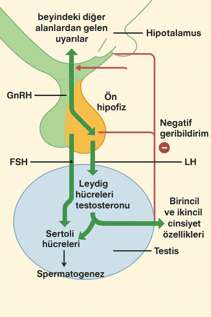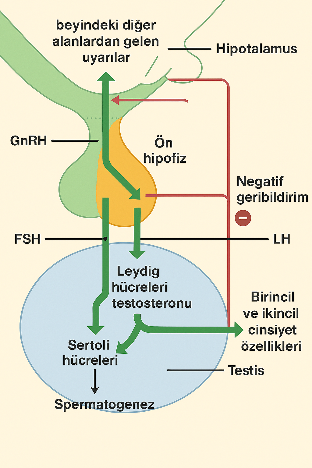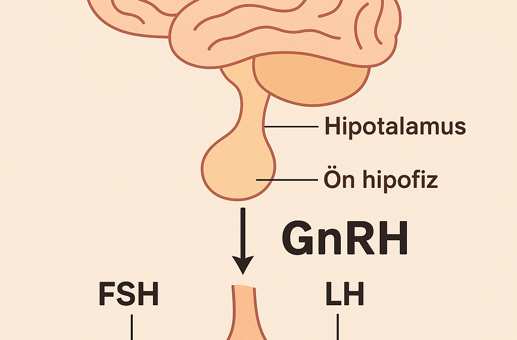 - Hipotalamus, gonadotropin salgılatıcı hormon (GnRH) üretir. Bu nöropeptid, arcuat çekirdekten pulsatil (nabızsal) şekilde salınarak hipofiz bezinin ön lobundaki gonadotrop hücreleri etkiler.