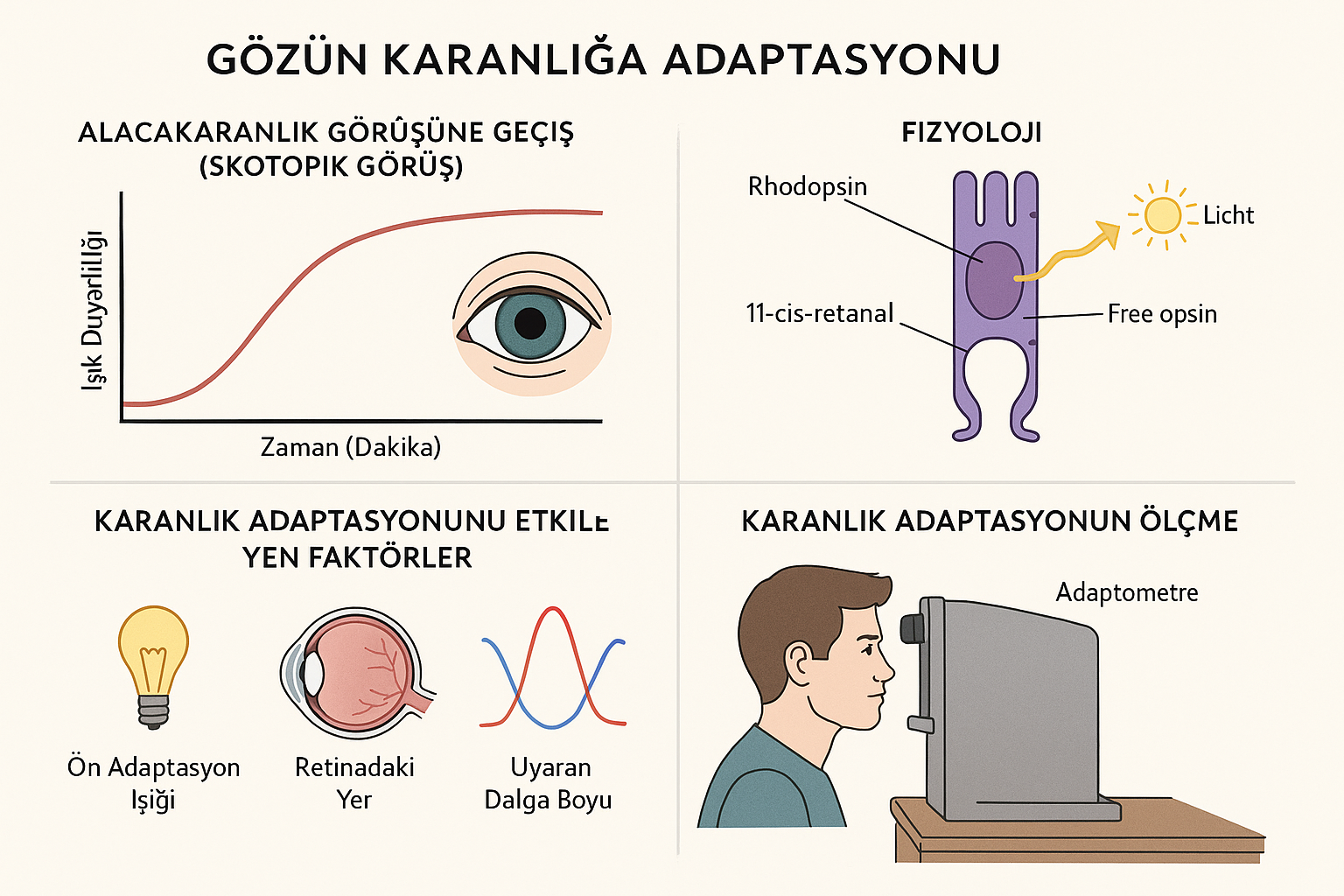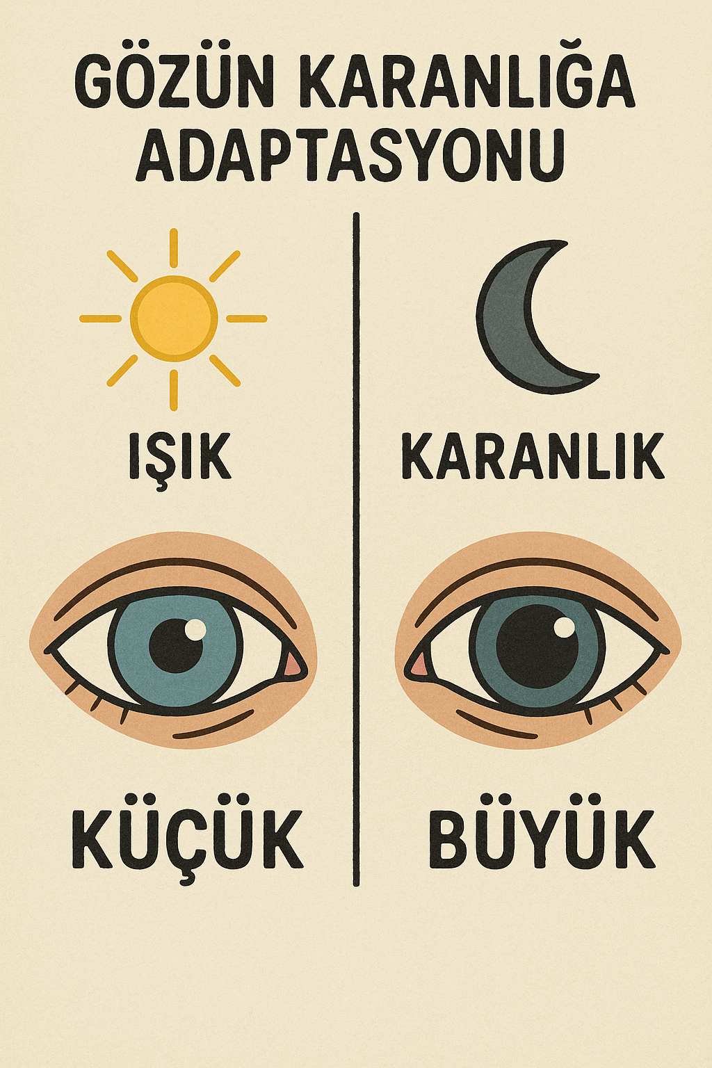 - Karanlık adaptasyonu, gözün parlak bir ortamdan karanlık bir ortama geçerken ışığa duyarlılığının zamanla artmasıdır.