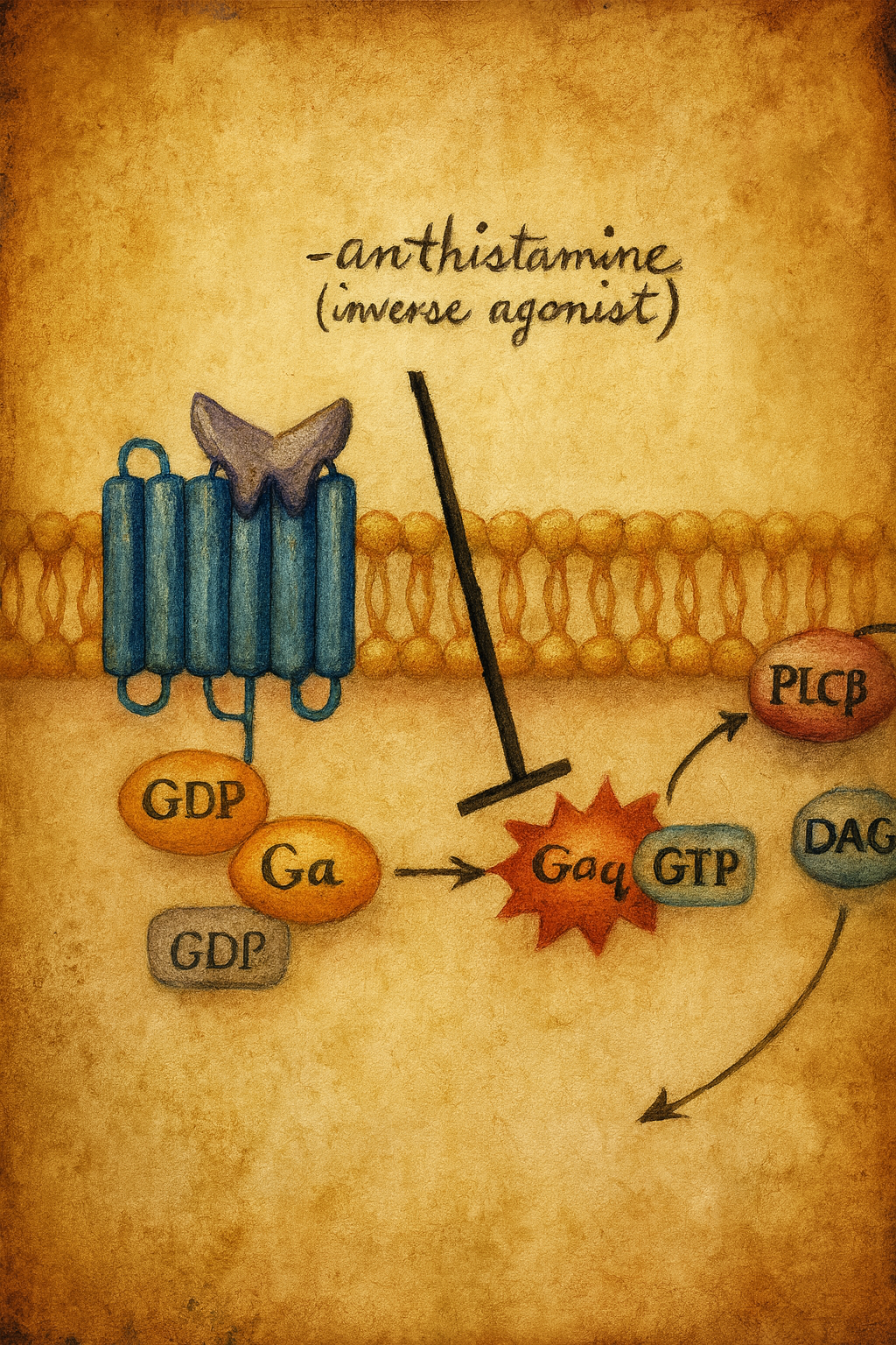 H1 reseptör antagonistlerinin çoğu gerçekte ters agonist gibi davranır: reseptörün bazal (aktif) konformasyonunu stabilize ederek histaminin etkisini kompetitif olarak azaltır. Klinik düzeyde sonuç;