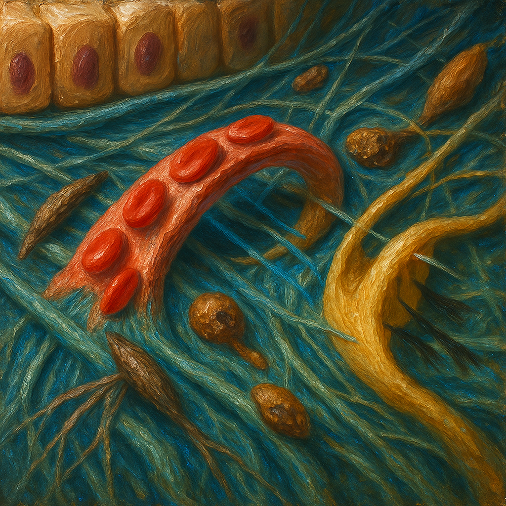 • Deri ve fasya: Dermal interstisyum, kolajen/elastin ağı ve yüksek su bağlama kapasitesiyle mekanik yükleri dağıtır; fasyal düzlemler boyunca düşük dirençli akış yolları, interstisyel sıvının bölgesel yeniden dağılımına olanak tanır.