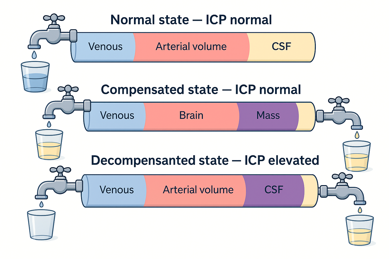 - İntrakraniyal kan: Arteriyol ve venüllerin tonusu ile dural sinüs drenajı BOS’a göre daha hızlı kompansasyon sunar; özellikle serebral venöz volümdeki değişim dakikalar ölçeğinde İKB’yi modüle eder.