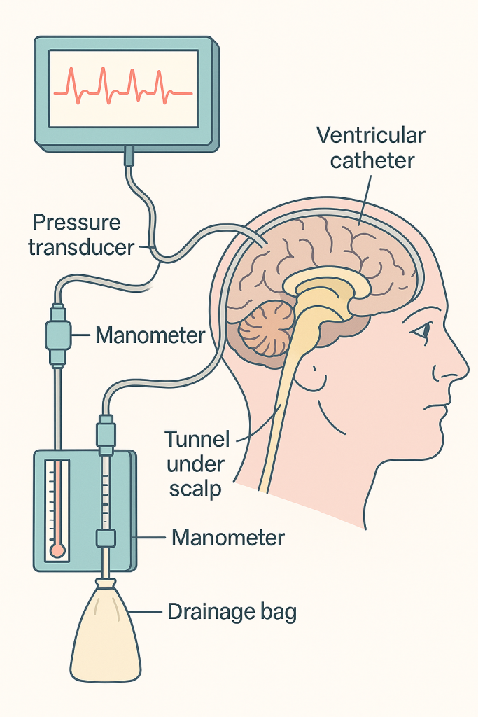 - Altın standart: Lateral ventriküle yerleştirilen eksternal ventriküler dren (EVD) kateteri; hem kesin basınç ölçümü hem BOS drenajına izin verir.