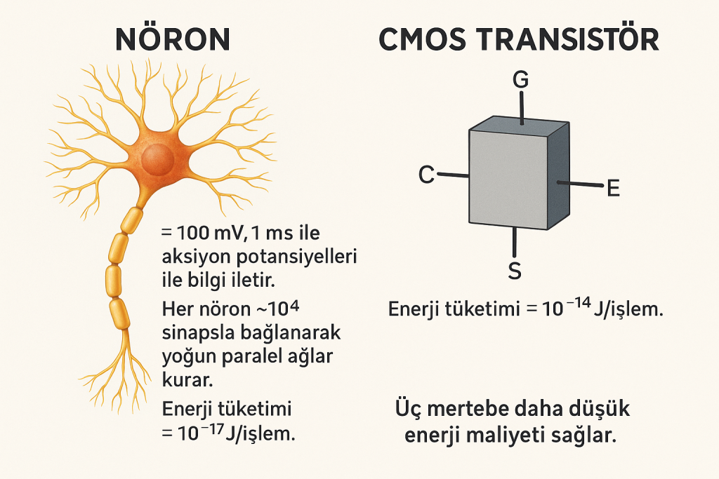 Nöronlar aksiyon potansiyelleri (≈ 100 mV, 1 ms) ile bilgi iletir. Her nöron ~10⁴ sinapsla bağlanarak yoğun paralel ağlar kurar. Enerji tüketimi ≈ 10⁻¹⁷ J/operasyon olup modern CMOS tranzistörden üç mertebe daha düşük enerji maliyeti sağlar.