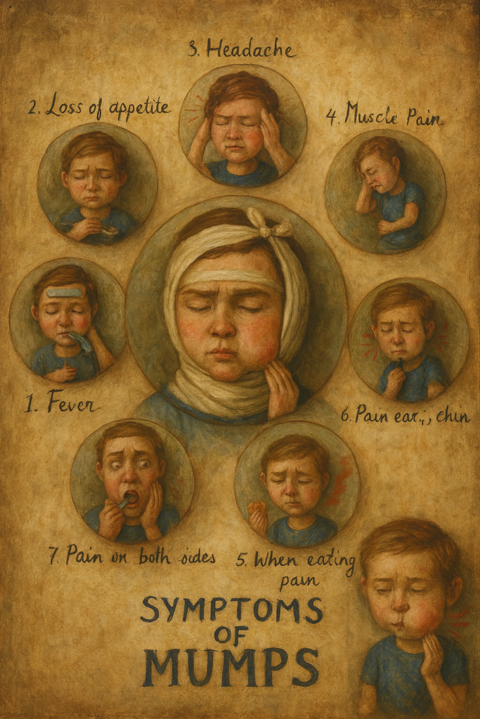 Şişmiş parotis bezleri, kulak memelerinin dışa doğru itilmesi ve ağrılı çiğneme ile ilişkilenen yüz ifadesi, “somurtan, şişmiş, memnuniyetsiz bir yüz” imgesini pekiştirir.