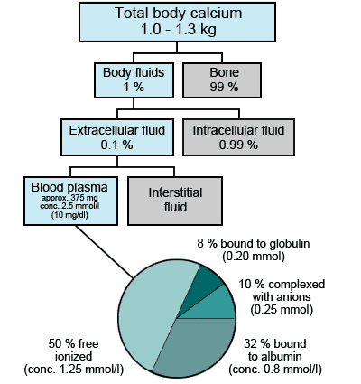 İnsan kanında yaklaşık olarak %50’sin iyon halinde, %35’i Albumin gibi proteinlere bağlı, %15’i ise Bikarbonat, Laktat, Sitrat veya Fosfat gibi komplekslere bağlanmış halde bulunur. Kanda bulunması gereken normal kalsiyum derişim değeri 2,2-2,6 mmol/l’dır.