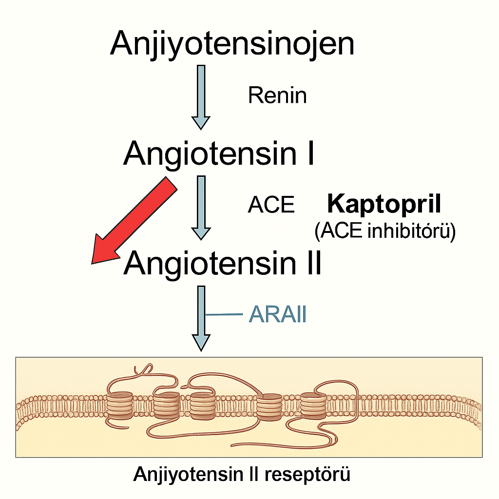 Kaptopril, anjiyotensin dönüştürücü enzimi (ACE) inhibe ederek anjiyotensin I’in vazokonstriktör bir peptid olan anjiyotensin II’ye dönüşümünü engeller. Bunun sonucunda: