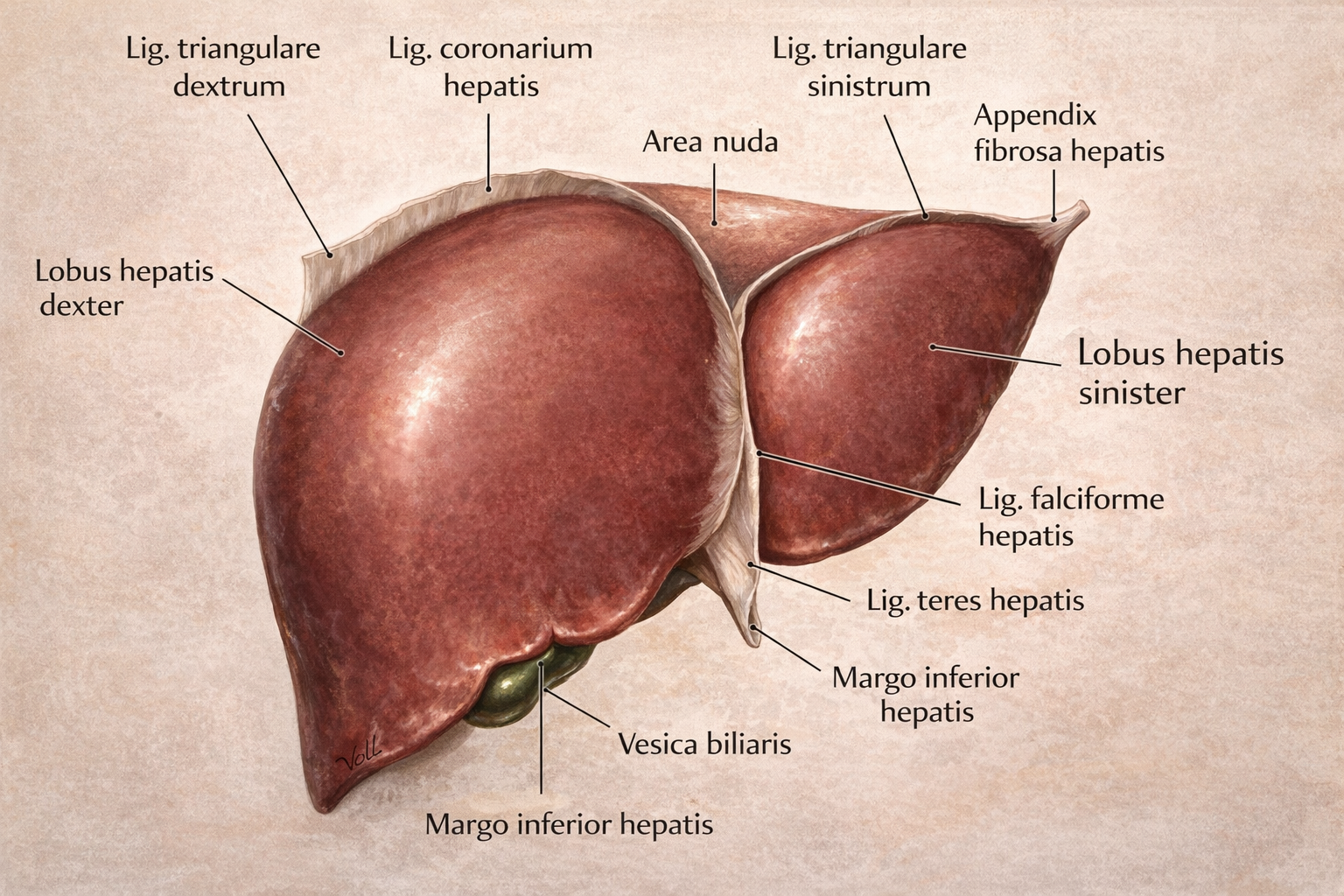 Karaciğer, karın boşluğu içinde çok sayıda peritoneal bağ aracılığıyla hem diyaframa hem de karın duvarına sabitlenir. Ligamentum falciforme hepatis, peritonun iki yapraklı bir katlanması olup karaciğerin sağ ve sol loblarını ön yüzeyde makroskopik düzeyde birbirinden ayırır ve organu karın ön duvarına bağlar. Bu bağın serbest kenarında ligamentum teres hepatis yer alır; bu yapı, fetal dönemde aktif işlev gören umbilikal venin fibröz kalıntısıdır. Koroner bağlar ve üçgen bağlar (ligg. triangularia) karaciğeri diyaframa bağlayan yapılar olup area nuda’nın sınırlarını belirler.