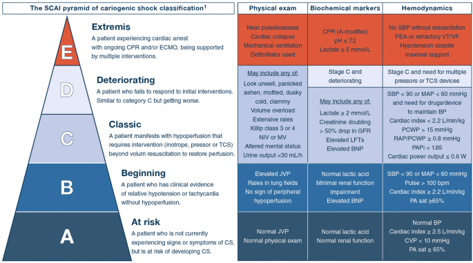 Gibi genel şok belirtilerine ek olarak Hipotansiyon ve solgunluk, göğüs ağrısı, nefes darlığı veya tıkanık jugular damarlar gibi semptomlar kardiyojenik şokta ortaya çıkar. Bunlar nedene bağlıdır. Bradikardi, ventriküler flutter veya pulmoner ödem de düşünülebilir.