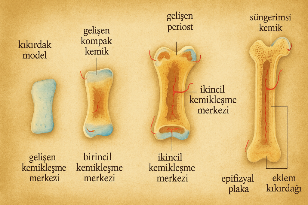 - Distal epifiz: Doğum sonrası 3–8 ay arasında kemikleşmeye başlar.