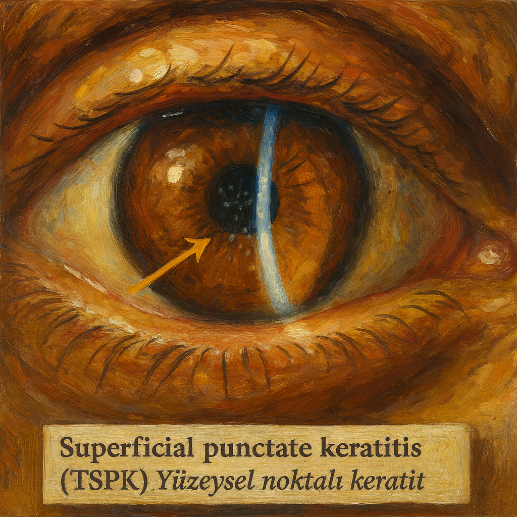 Korneal yüzeyden alınan epitel kazıntıları, atipik/dejenere epitel hücreleri ile hafif mononükleer ve polimorfonükleer hücre infiltrasyonu gösterebilir. Stromal tabakaya derin uzanım tipik değildir; bu, TSPK’yı stromal tutulumlu viral veya immün keratitlerden ayırır. Subepitelyal opasiteler olguların anlamlı bir bölümünde saptanabilir ve kronik/hırçın seyirde ince periferik neovaskülarizasyon eşlik edebilir.