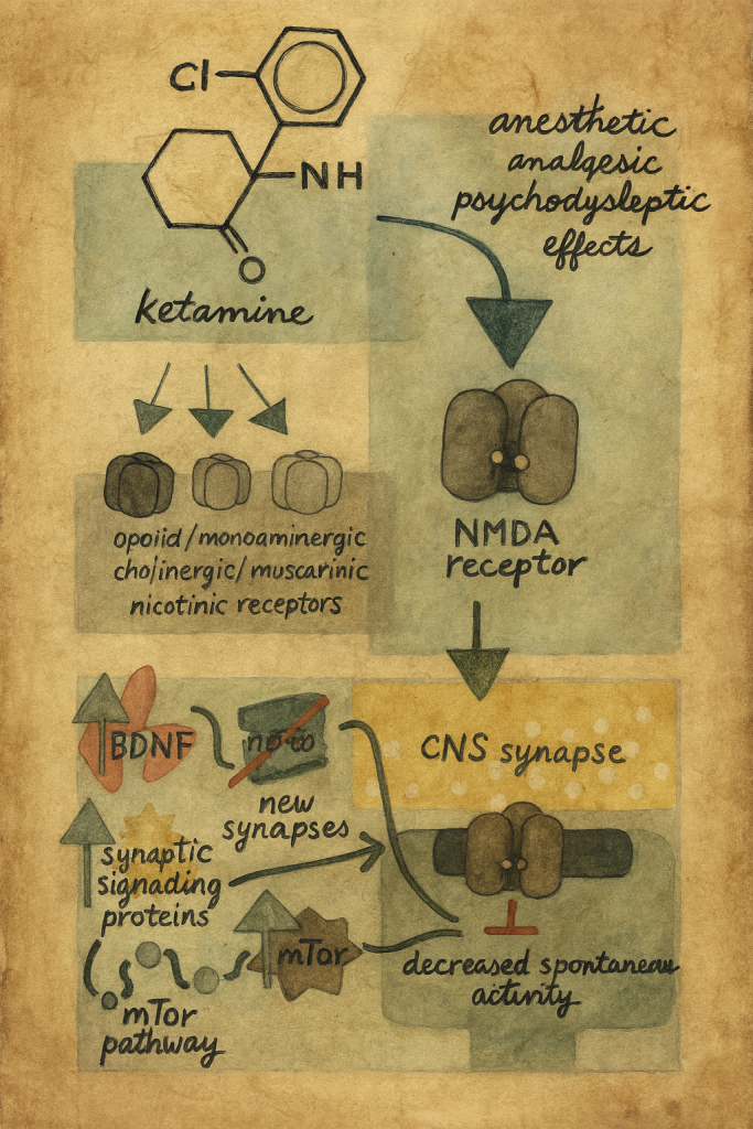 Ketamin, klasik anlamda “saf” bir ilaç olmaktan çok, multimodal etki profiline sahip bir nörofarmakolojik araçtır. En belirgin ve en iyi tanımlanmış etkisi, glutamat sistemi üzerinden, özellikle NMDA reseptörüne yönelik antagonizmadır; ancak bununla sınırlı değildir.