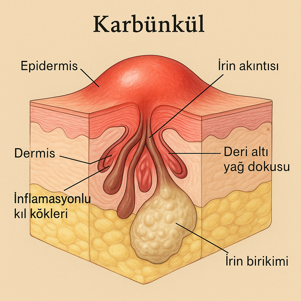 Karbunküller sıklıkla boyun arkası, sırt, uyluk gibi yağ dokusunun bol olduğu, nemli ve terlemeye meyilli bölgelerde ortaya çıkar. Lezyon başlangıçta kırmızı, hassas bir nodül şeklinde başlar; zamanla çevre dokuda şiddetli ödem, eritem (kızarıklık), fluktuasyon (irin birikimi hissi) ve nekroz ile birleşir. Lezyonun merkezi sıklıkla birden fazla drenaj açıklığı (sinüs traktı) geliştirir ve bu açıklıklardan yoğun pürülan akıntı gözlenir. Geniş yüzey alanını tutması ve ağrının şiddetli olması karakteristiktir.