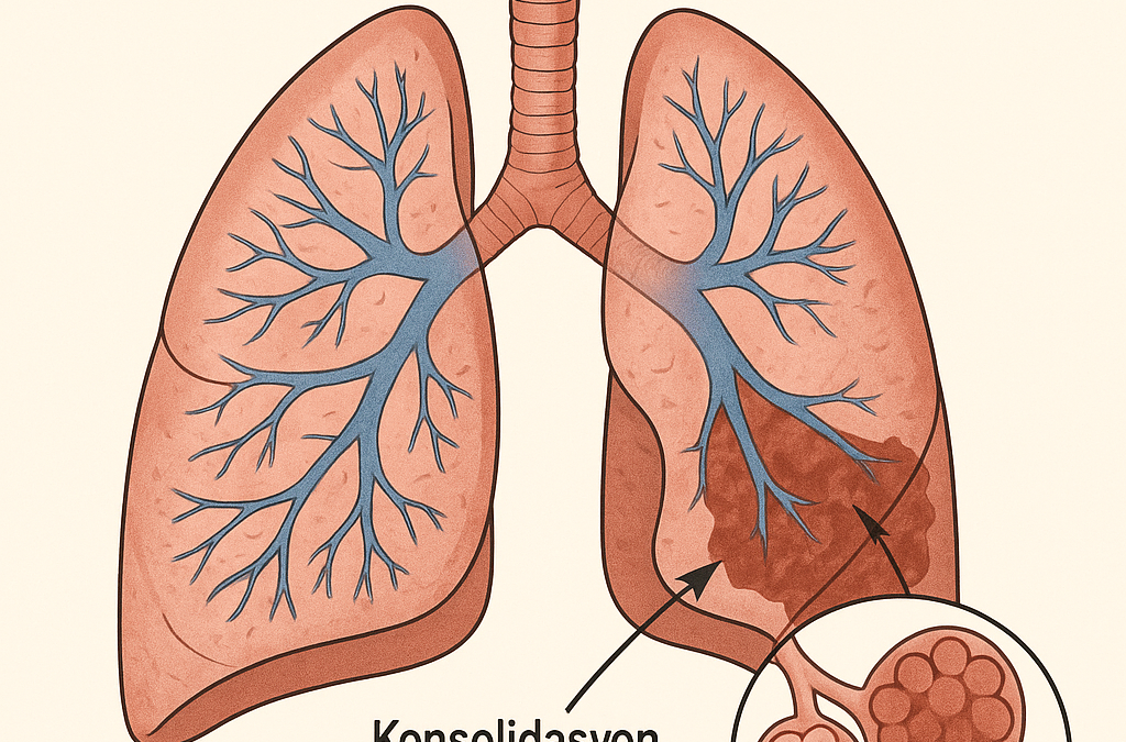 Pulmoner konsolidasyon, normalde hava içeren alveollerin sıvı (eksüda, transüda), hücresel kalıntı veya diğer patolojik ürünlerle dolarak radyolojik olarak opaklaşmasıdır. Bu değişim, akciğerin süngerimsi yapısını yitirip katı bir yoğunluğa ulaşmasına neden olur.