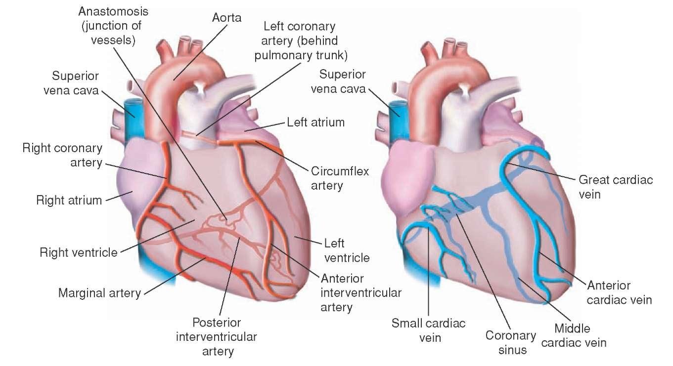 Kalp dokularına kan götüren damarlar koroner arter(coronary arteries), oksijeni alınmış kanı kalp kasından götüren damarlar ise kardiyak ven(cardiac veins) olarak adlandırılır.