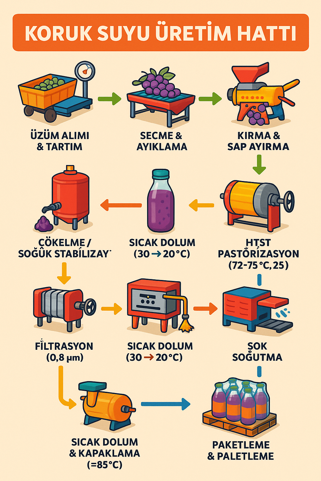 Koruk suyu (uluslararası literatürde verjuice), Vitis vinifera üzüm salkımlarının henüz olgunlaşma eşiğine (≈ 50–70 Gün Çiçeklenme Sonrası) ulaşmadan toplanıp preslenmesiyle elde edilen, fermente edilmemiş, yüksek asitli bir meyve suyudur. Üretim hattı kabaca (i) hasat → (ii) yıkama ve sap ayıklama → (iii) kırma‑ezme → (iv) pnomatik presleme → (v) tortudan ayırma/süzme → (vi) %85 °C × 15 s pastörizasyon veya soğuk‑filtreden geçirme → (vii) asetik oksidasyonun engellenmesi için inert dolum adımlarından oluşur. Endüstriyel ölçekte, partikül yükünü azaltmak için bentonit/pektinaz uygulaması ve bulanıklığı düşürmek amacıyla 0.45 µm membran filtrasyonu yaygındır.
