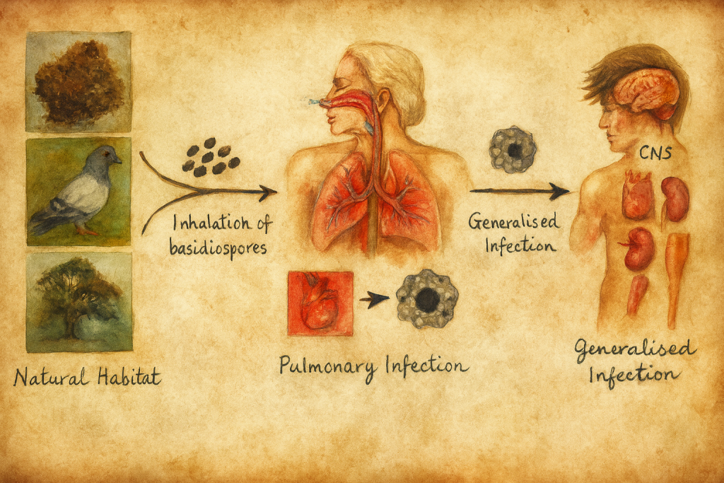 - yüzyılın ortalarında çevresel mikoloji gelişmeye başladığında, araştırmacılar ortak bir ipucuna ulaştılar: şehirlerde toplanan güvercin dışkıları. Yapılan kültürlemelerde C. neoformans’ın bu dışkılarda bol miktarda bulunduğu anlaşıldı. Güvercinlerin kendileri hastalanmıyor, fakat mantarı bağırsaklarında taşıyor ve dışkıları aracılığıyla tüm şehre yayıyorlardı. Böylece patojenin çevresel döngüsü netleşti ve inhalasyon yoluyla bulaşın ana kaynak olduğu belirlendi. Bu keşif, hastalığın epidemiyolojisini anlamada dönüm noktasıydı.