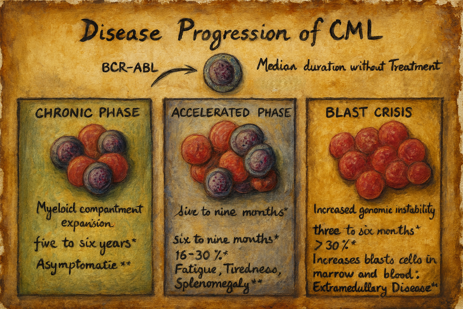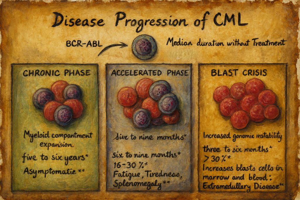 KML kronik stabil faz (KP) ile başlar. Bu durum 6 aydan 20 yıla kadar sürer. Hastaların %90 ila 95’i ilk tanıda SP’dedir.