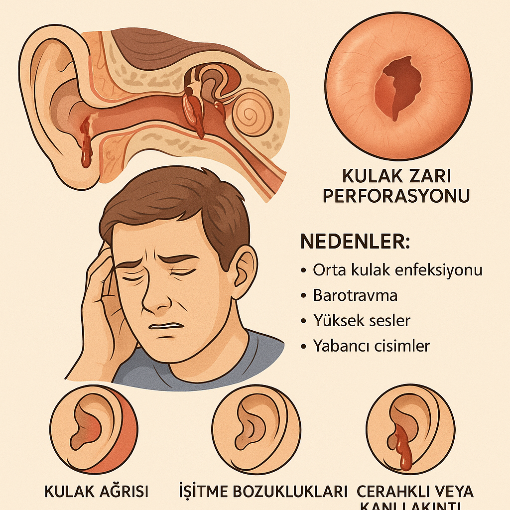- Enfeksiyon: Akut otitis media sırasında orta kulak basıncının artması sonucu kulak zarı yırtılabilir; kronik otitis media da tekrarlayan iltihap ve basınç nedeniyle perforasyona yol açabilir.