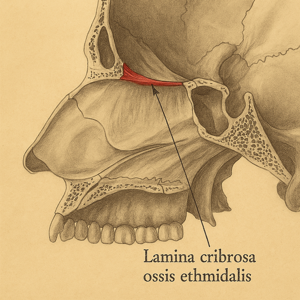 Os ethmoidale, viscerocranium’un (yüz iskeletinin) bir parçası olan ve kafatası tabanının ön kısmında yer alan bir kemiktir. Bu kemiğin en karakteristik bölümlerinden biri olan lamina cribrosa, os ethmoidalenin üst yüzeyinde yer alır ve anatomik olarak şunlarla ilişkili bir pozisyondadır: