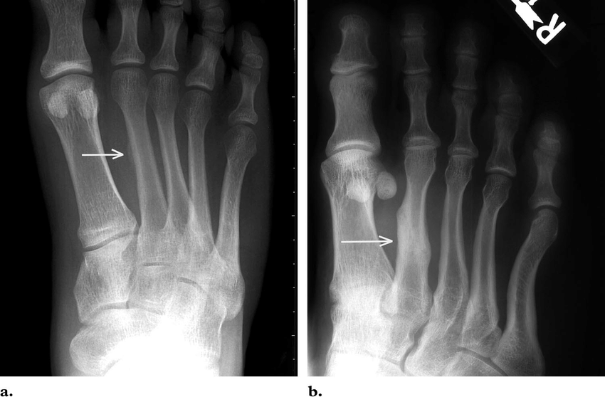Kaynak:https://www.researchgate.net/profile/Tim_Hunter5/publication/8452212/figure/fig18/AS:364948376047623@1464021881282/March-fracture-fatigue-fracture-a-b-Frontal-radiographs-of-the-right-foot-in-a.png